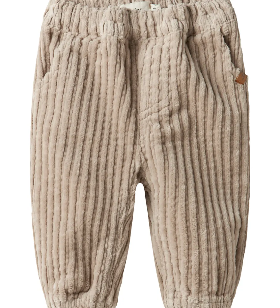 Elegante Lil Atelier fløjlsbukser i en lysebeige nuance. Lil Atelier fløjlsbukserne har en markant fløjlstruktur med elastik i taljen og ved anklerne, som sikrer en god pasform. Fløjlsbukserne er designet med to åbne lommer i siderne, der giver et praktisk touch.