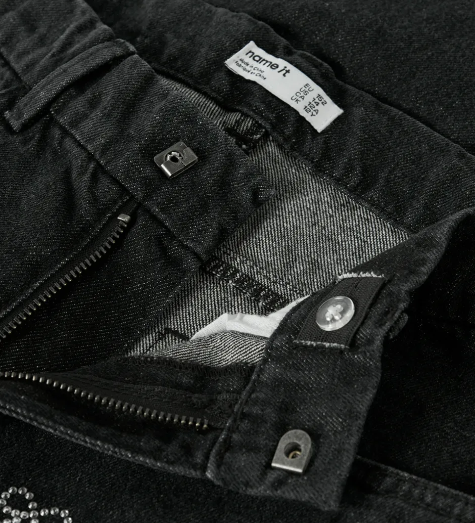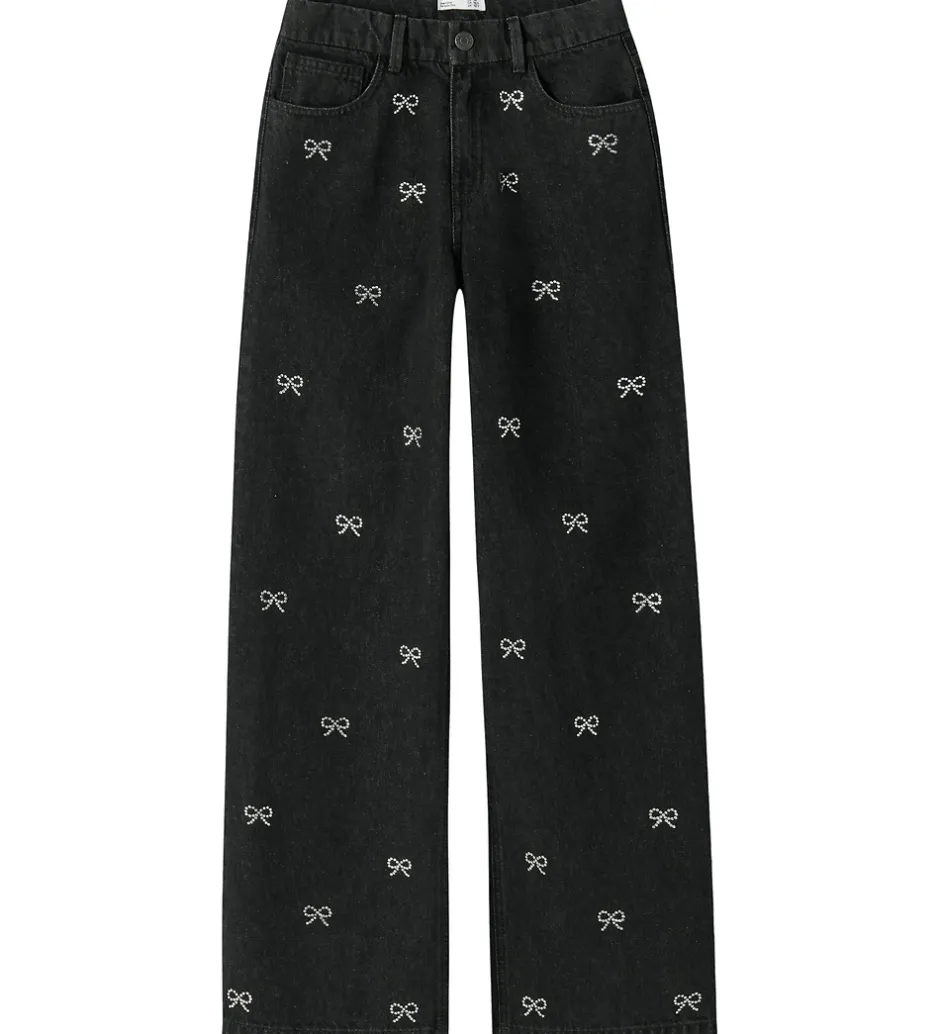 Stilfulde Name It jeans i sortmeleret denim nuance med små, elegante sløjfer af similisten fortil. Name It jeansene har en klassisk lukning med knap og lynlås samt praktiske lommer foran. De har også indvendigt justerbare elastikker i buksekanten. Jeansene har en standard lommedesign og giver et moderne udtryk.