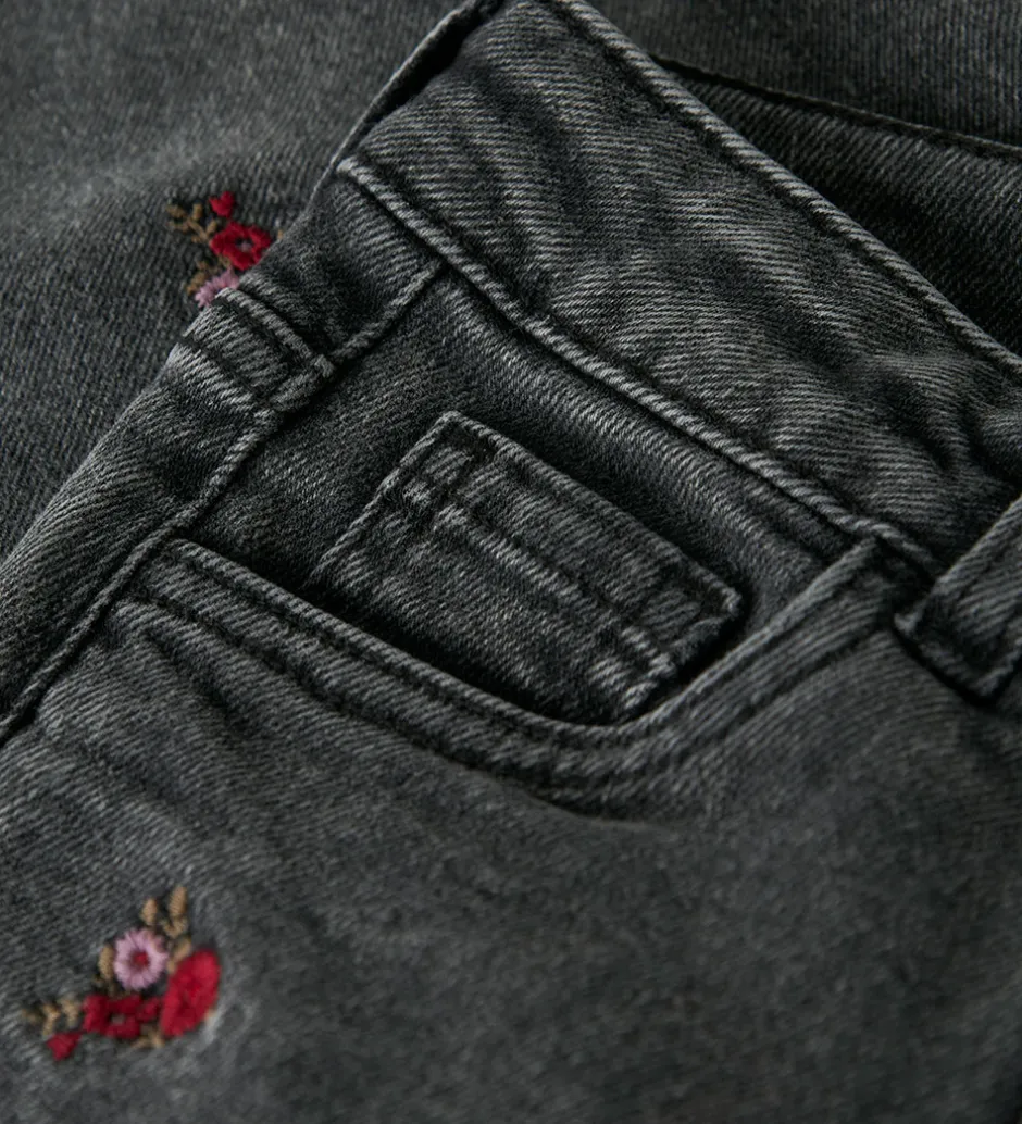 Charmerende Name It jeans i mørkegråt denim i en strækbar kvalitet og med smukke blomsterbroderier spredt over hele designet. Name It jeansene lukkes med en trykknap, og i livet har de en justerbar elastikkant. Både fortil og bagpå er der praktiske lommer.