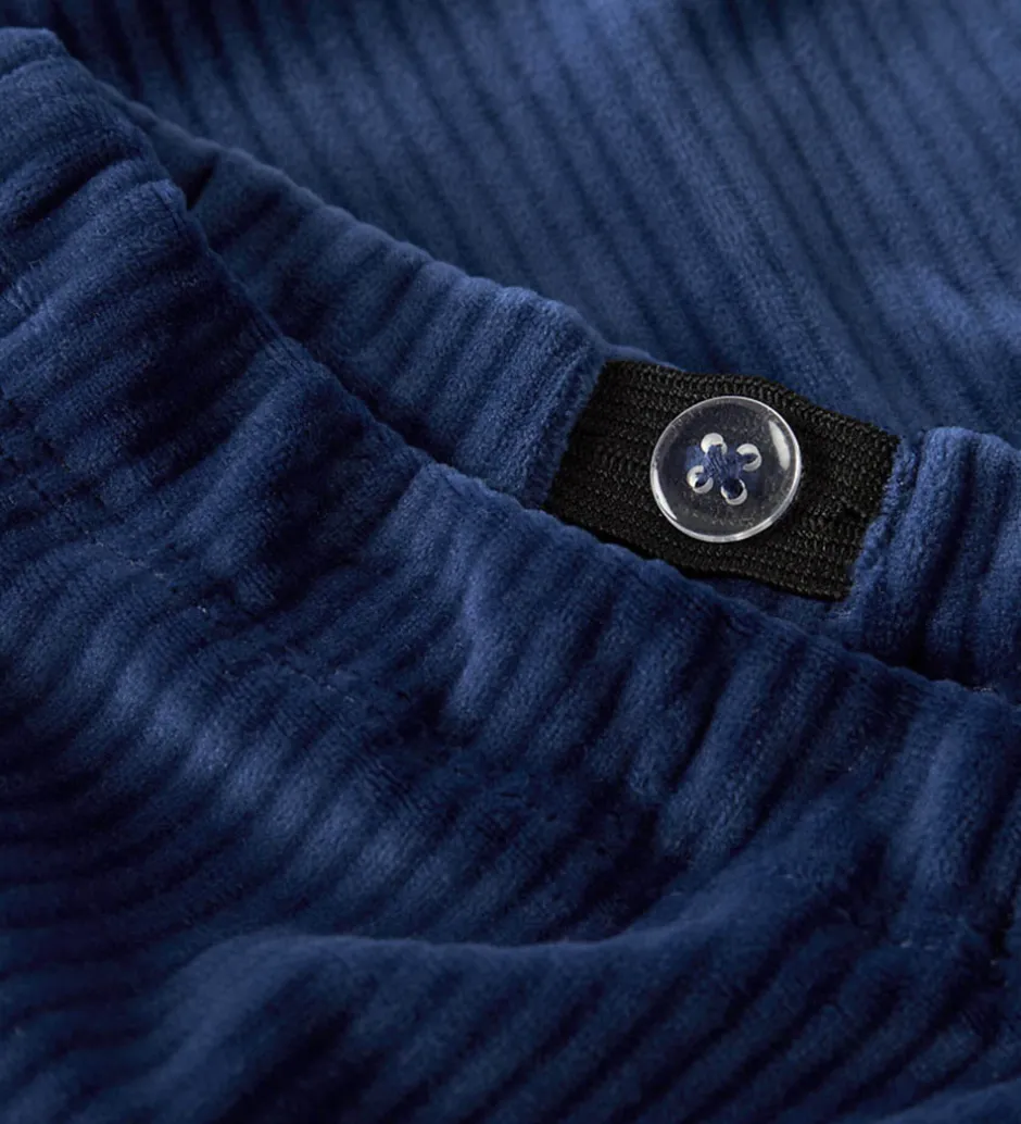 Stilfulde Name It velourbukser i en dyb, marineblå nuance med elegante lodrette striber. Name It velourbukserne har en elastisk talje, der sikrer en god pasform. Benene afsluttes med rene kanter, der bidrager til et sofistikeret og enkelt look.