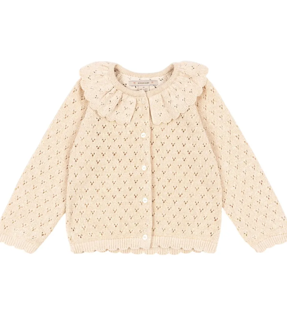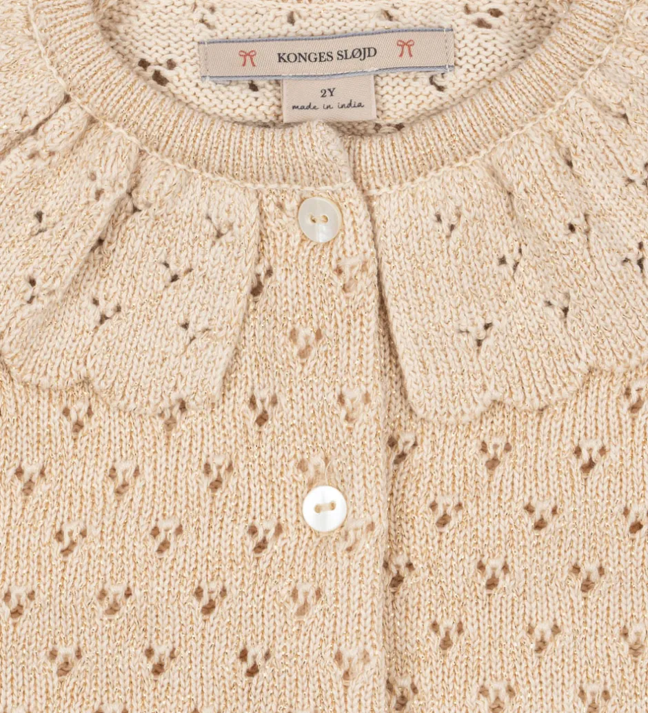 Yndig Konges Sløjd cardigan i en blød, beige nuance med glimmer og et fint hulmønster og, der giver et elegant udtryk.