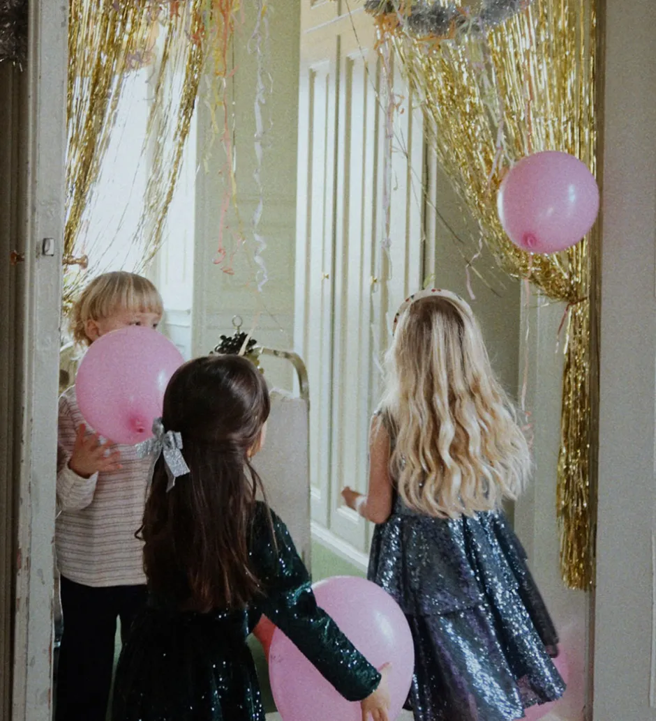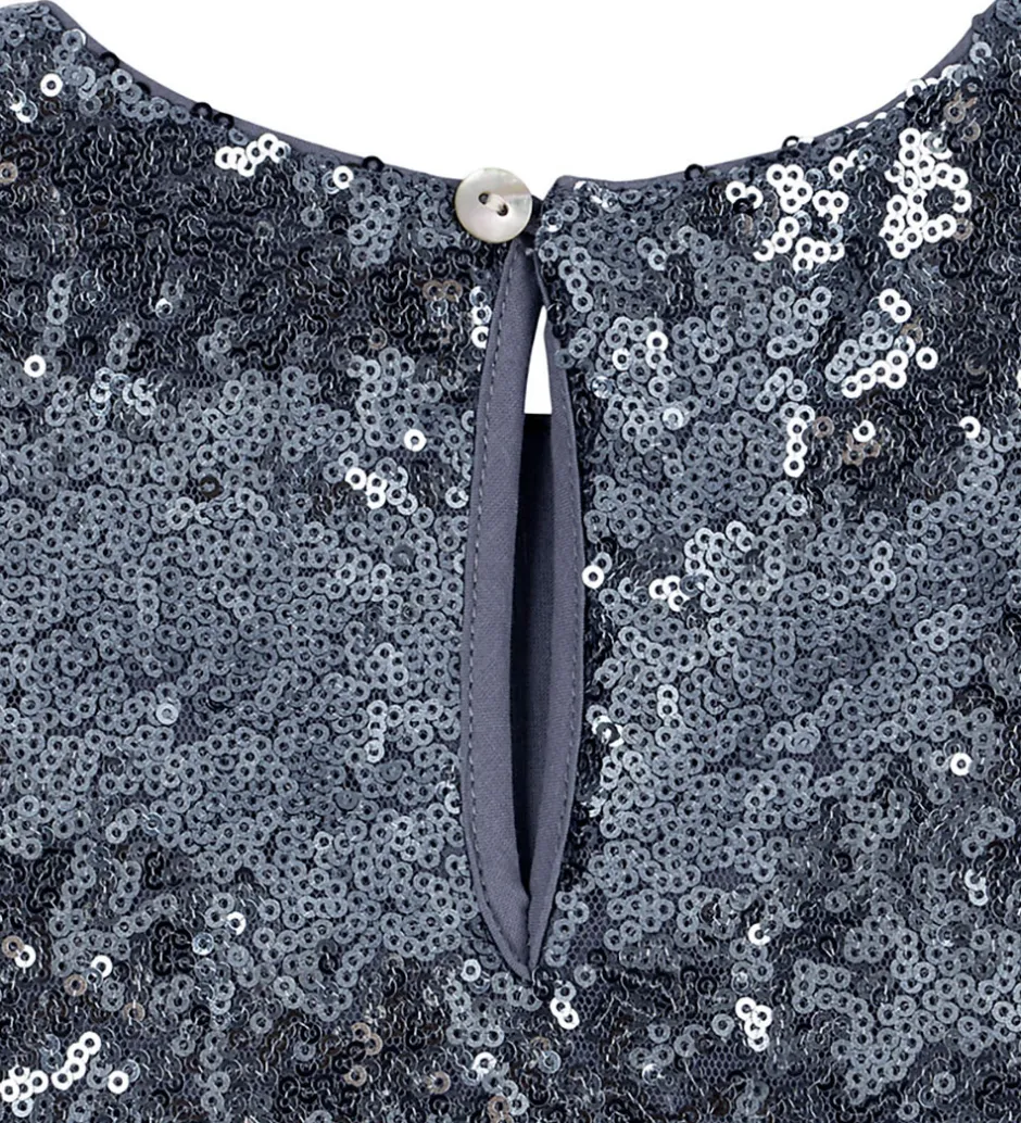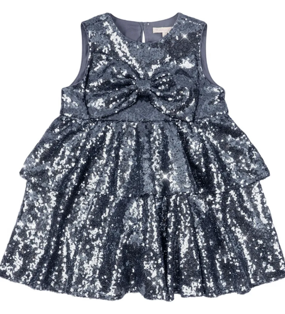 Elegant Konges Sløjd kjole med blå pailletter med et metallisk skær. Kjolen er helt uden ærmer, og fortil sidder der en stor sløjfe. Nedenunder falder skørtet med masser af vidde og i forskuldte lag. Kjolen lukkes i nakken med en knap. Kjolen har et ekstra lag af bomuld på indersiden.