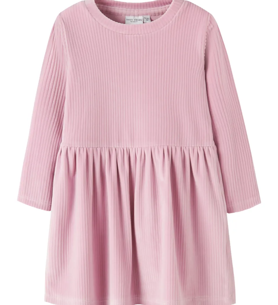 Behagelig Name It kjole i en sart, lyserød nuance. Name It kjolen har lange ærmer og en rund halsudskæring. Kjolen har en blød velour-struktur, der giver et elegant udtryk, mens nederdelen er skåret i et blødt og fyldigt design.