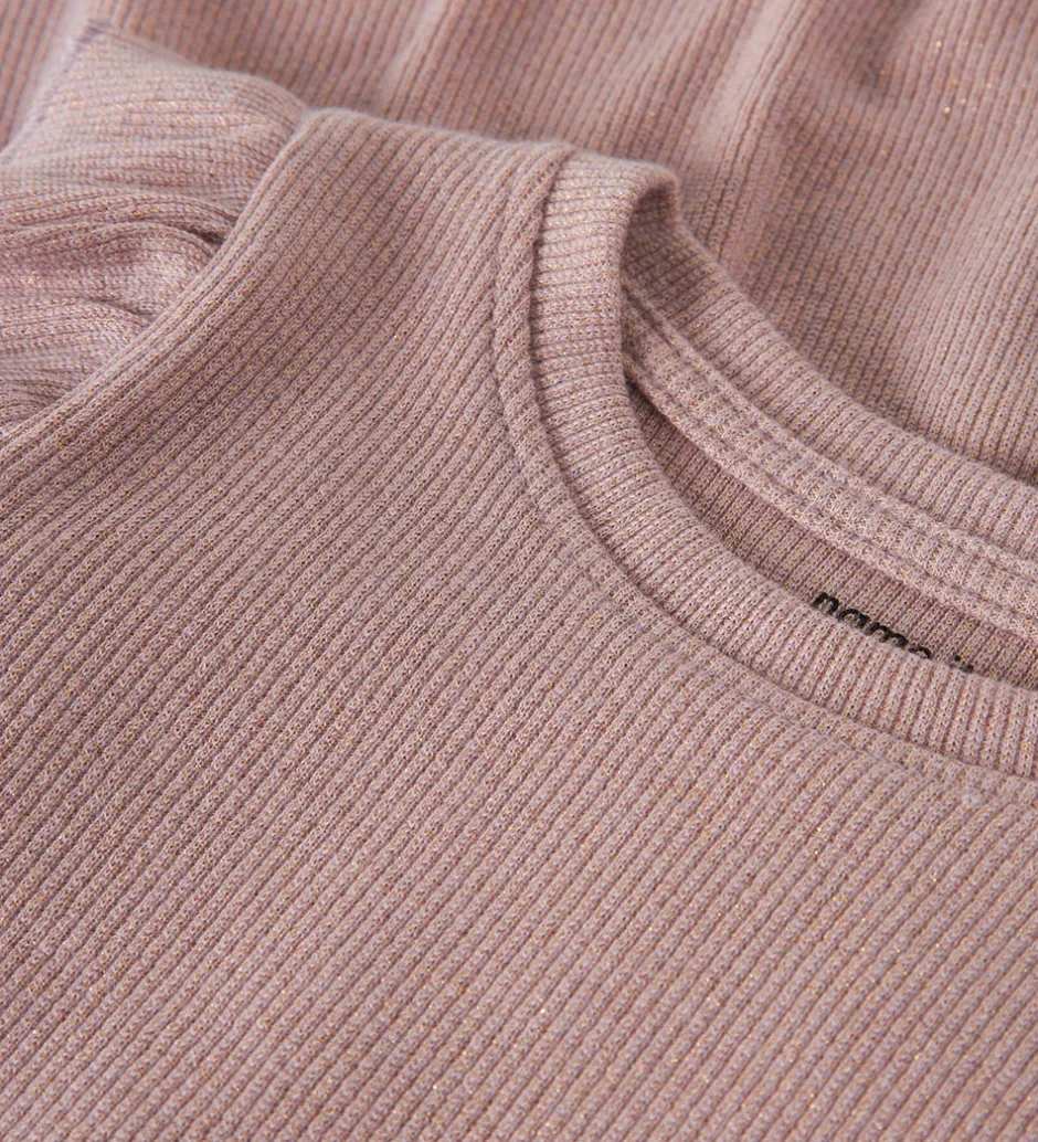Elegant Name It kjole i en afdæmpet, lyserød nuance med guldfarvet glimmer. Name It kjolen har lange ærmer, rund halsudskæring og flæsedetaljer ved skuldrene. Kjolen er lavet i et ribbet stofmønster, der tilføjer struktur og et stilfuldt udtryk.