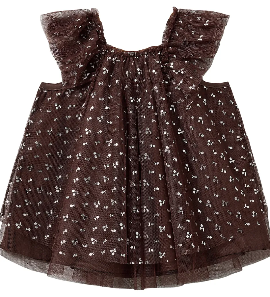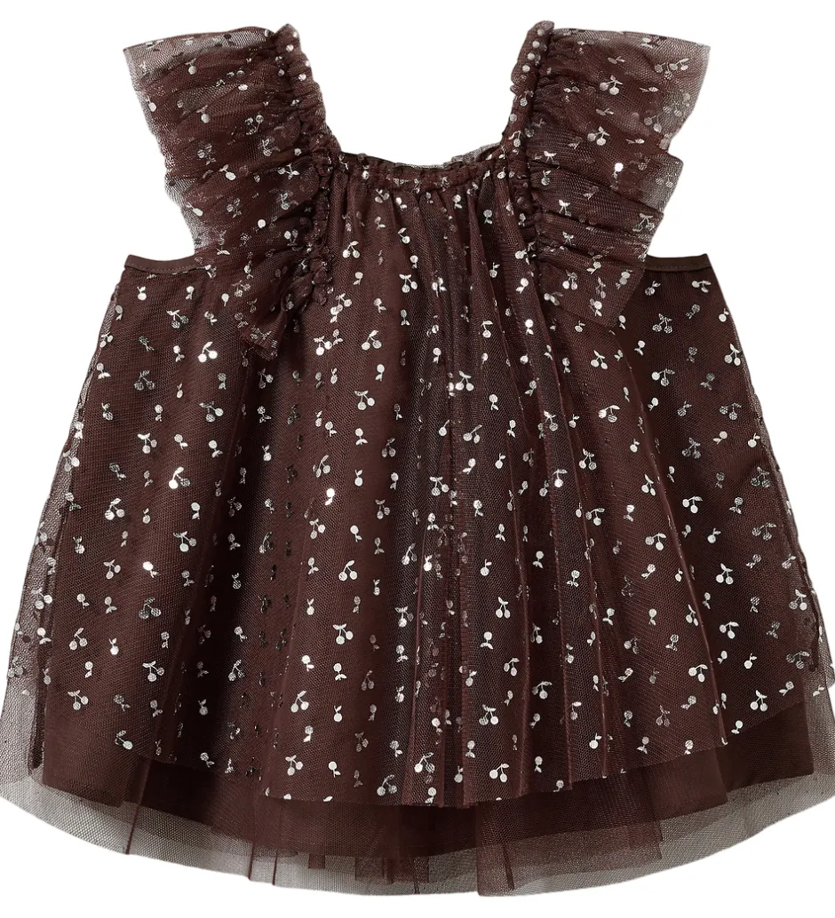 Stilfuld Sofie Schnoor tylkjole i dyb, rødbrun nuance med små, spredte kirsebærprint i sølv.