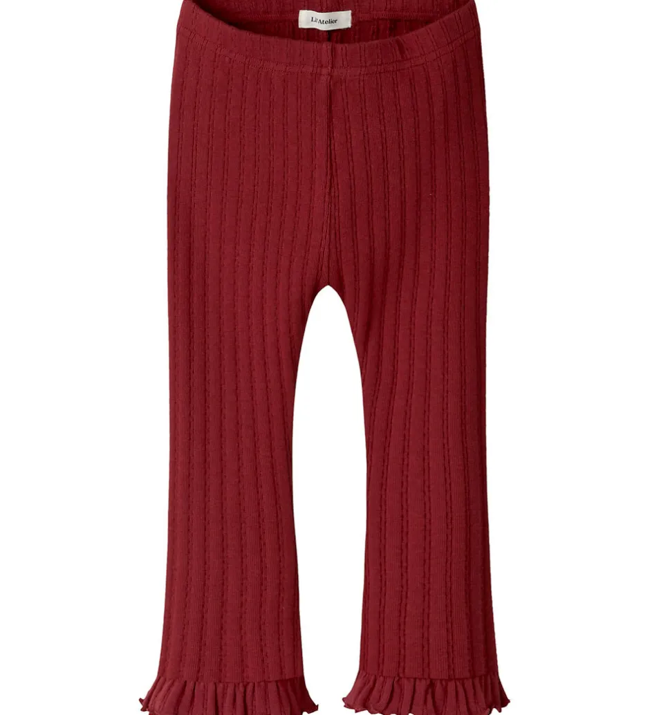 Charmerende Lil’ Atelier leggings i en dyb rød farve, i en ribstruktur med et let hulmønster. Lil’ Atelier leggingsene har en elastisk talje og fine flæsedetaljer ved anklerne.