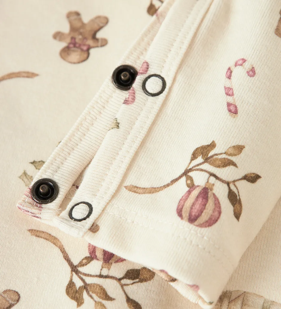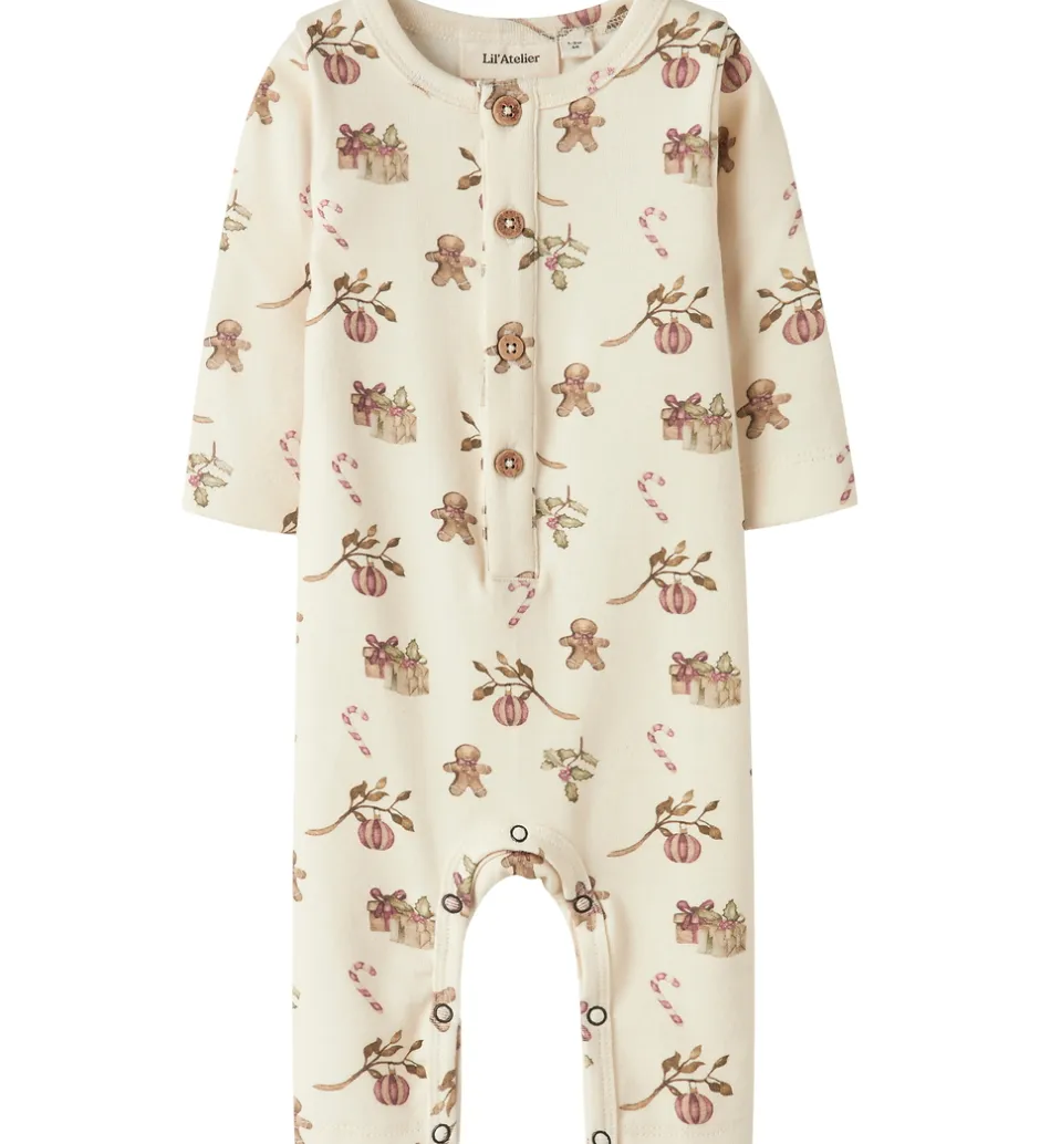Charmerende Lil Atelier heldragt i beige med et yndigt print af julemotiver som peberkagemænd, slikstokke, gaver og gran.