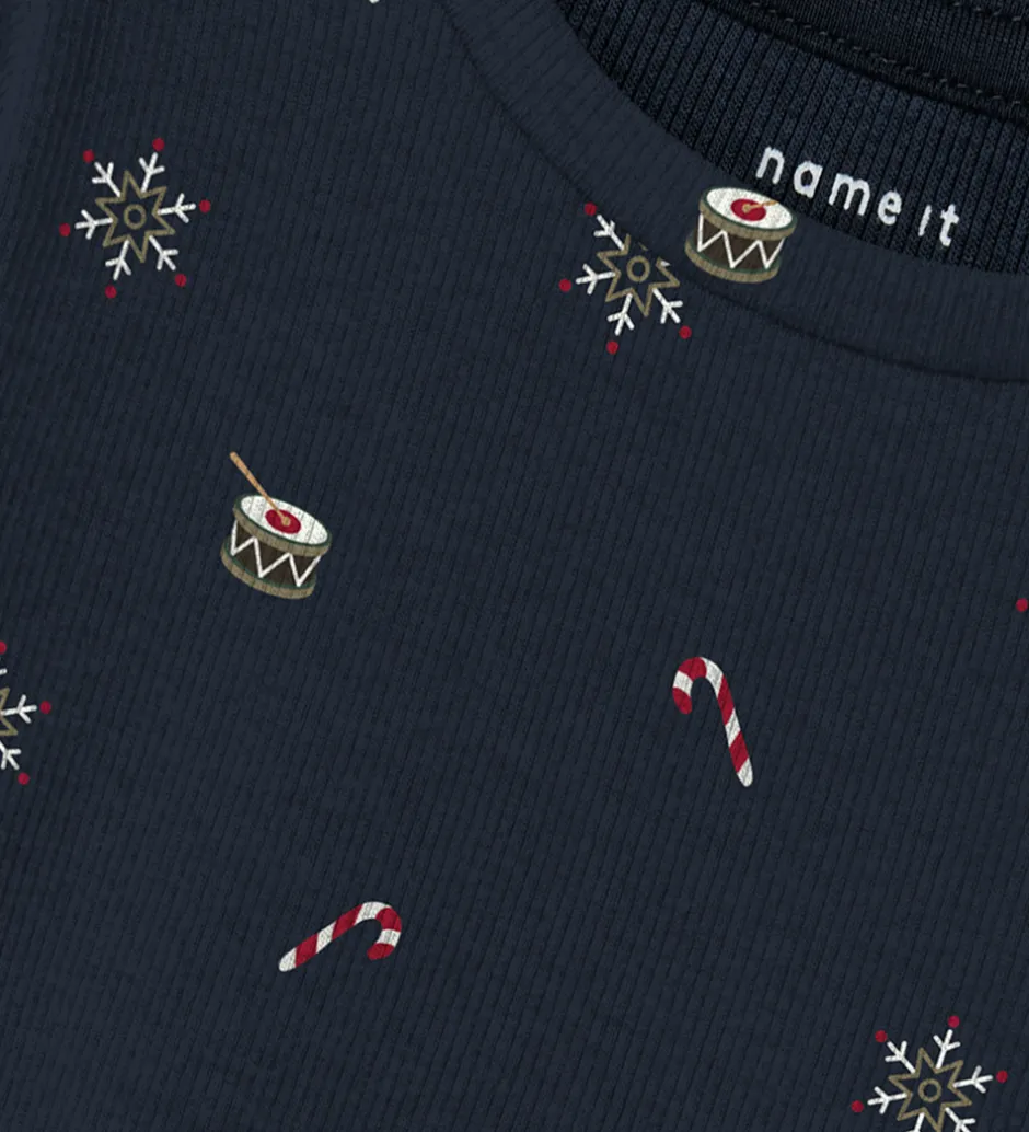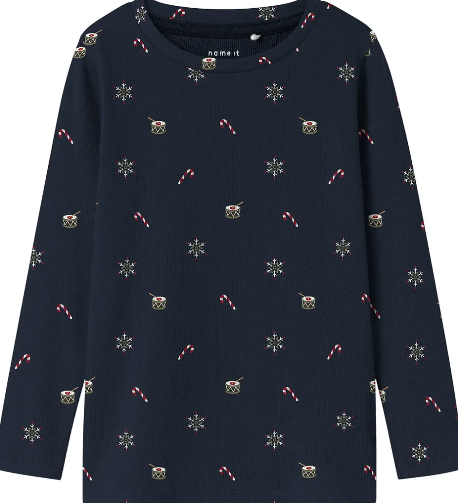 Charmerende Name It bluse i navyblå med alloverprint af små julemotiver og ribstruktur. Blusen har en rund halsudskæring og lange ærmer.