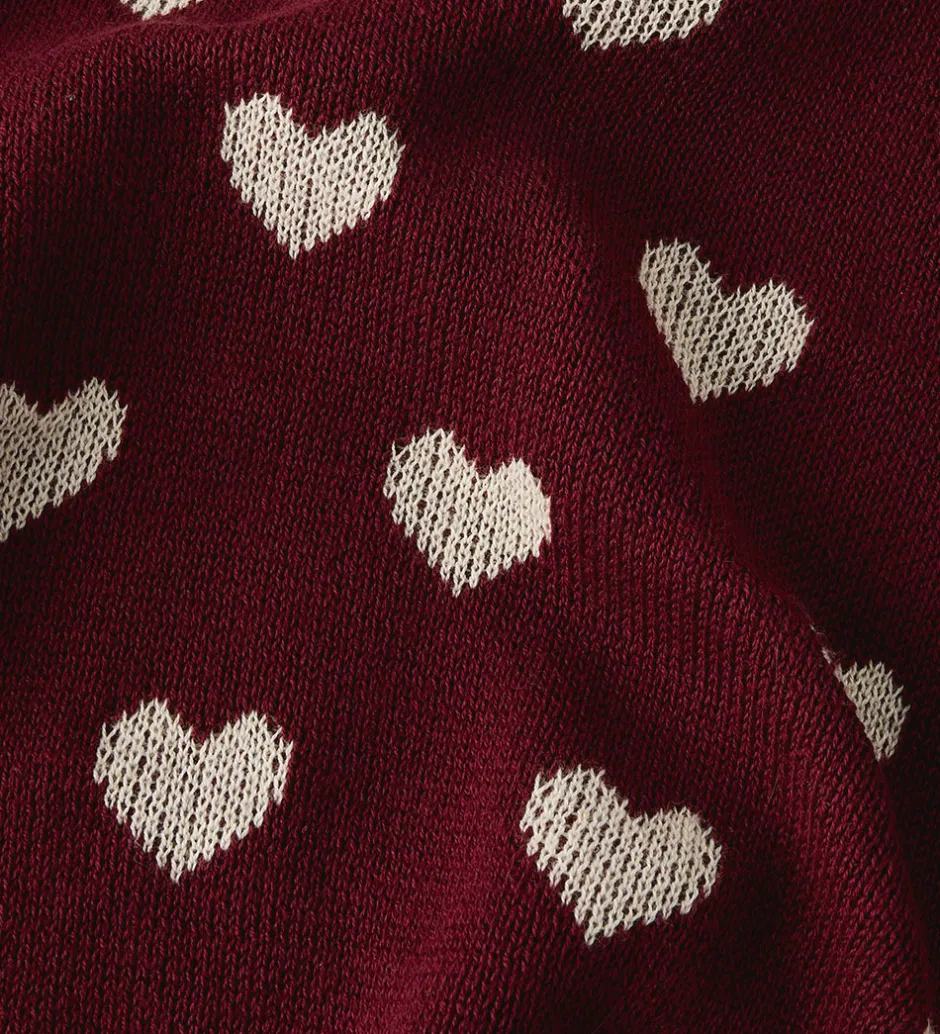 Charmerende Name It bluse i mørkerød med et fint mønster af hvide hjerter. Blusen har strikket struktur, og er designet med lange ærmer og en rund halsudskæring.