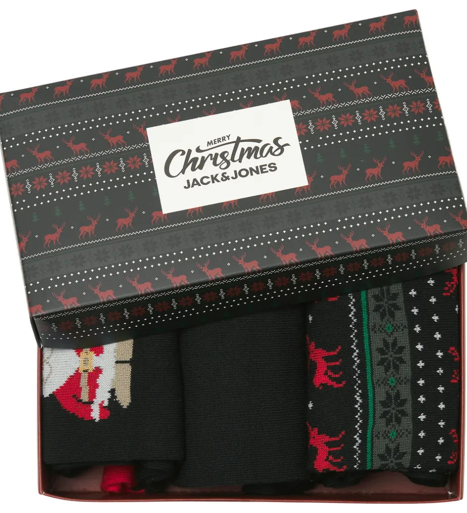 Festlig Jack & Jones gaveæske med tre strømper med forskellige julemotiver med rensdyr og juletræer i sorte, røde og grønne nuancer. Strømperne har en smal ribkant øverst på skaftet.