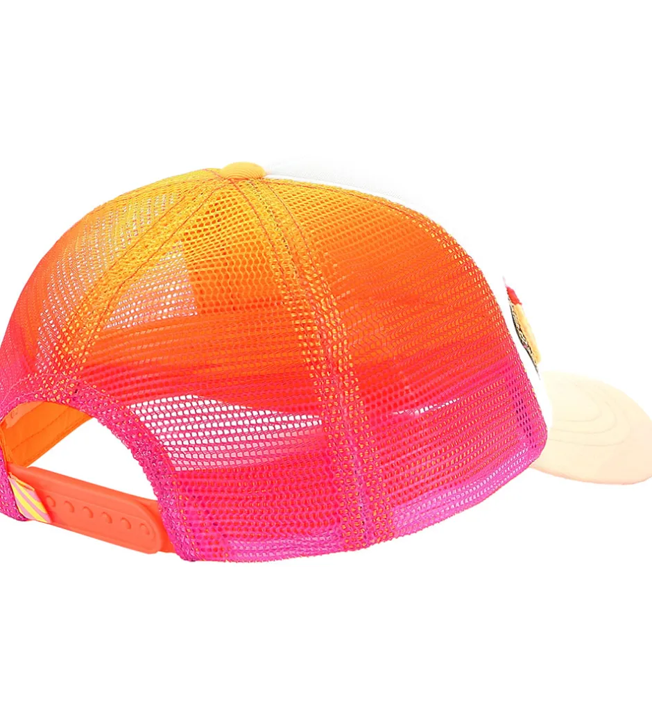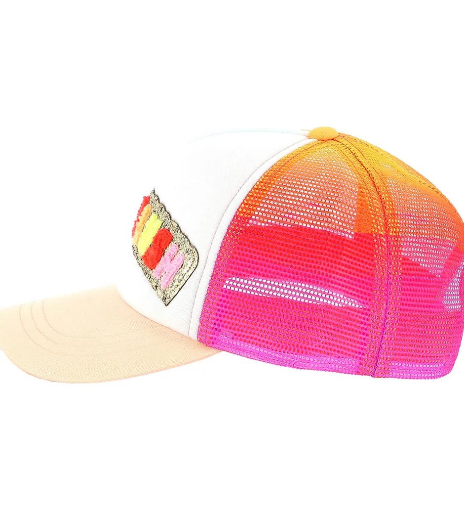 Smart Billieblush kasket med hvid front hvorpå logoet fremhæves af guldglimmer. Kasketten har netdetaljer i orange og pink, hvilket giver et sjovt og livligt udtryk.
