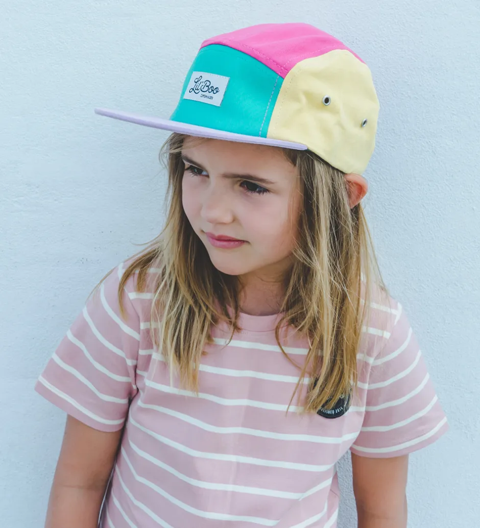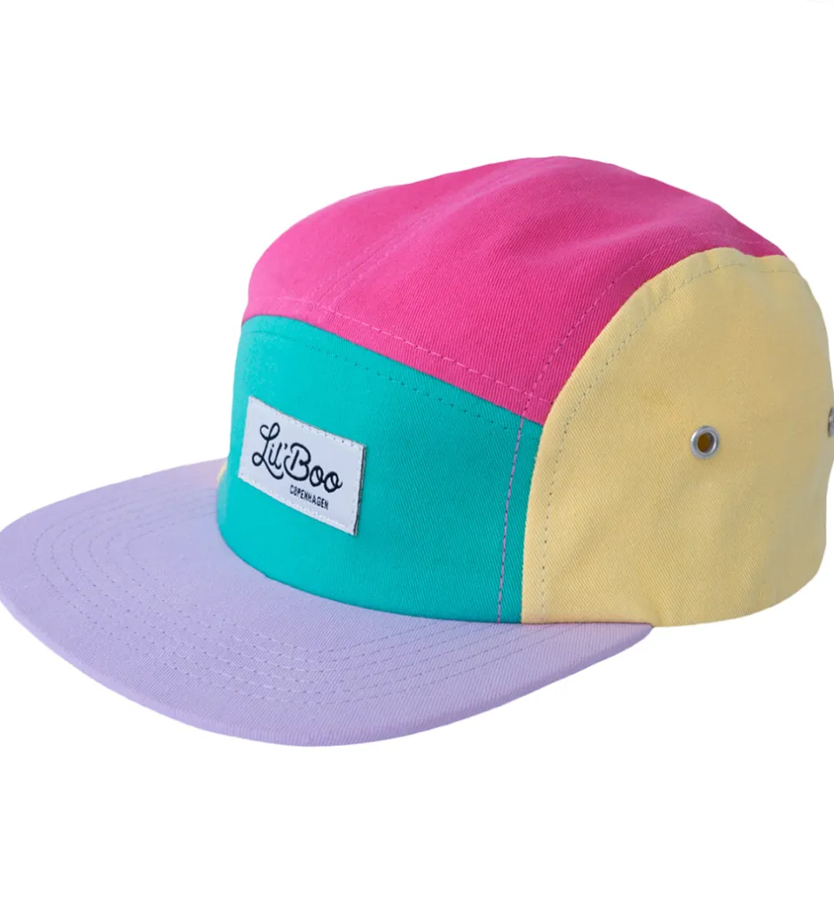 Dejlig Lil’ Boo kasket med flotte blokfarver i gul, rosa og grøn, samt en lavendel skygge. Fortil er der en fin logoapplikation.