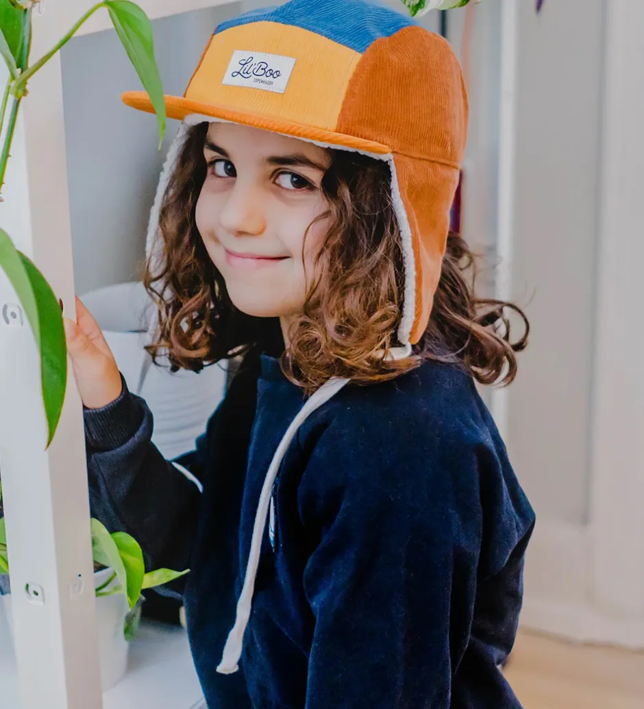 Farverig Lil’ Boo Copenhagen kasket med en ribbet struktur, i en kombination af orange, brun og blå med en logoprint foran. Denne kasket har blødt teddyfleece og lange ører hvilket gør den ideel til at holde hovedet varmt på kolde dage.