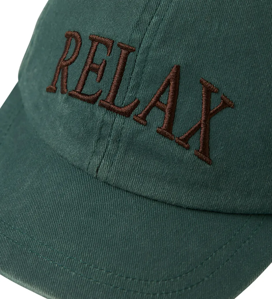 Elegant Name It kasket i en dyb, grøn nuance med teksten “RELAX” broderet i brun. Kasketten har en klassisk, buet skygge, der giver skygge fra solen.