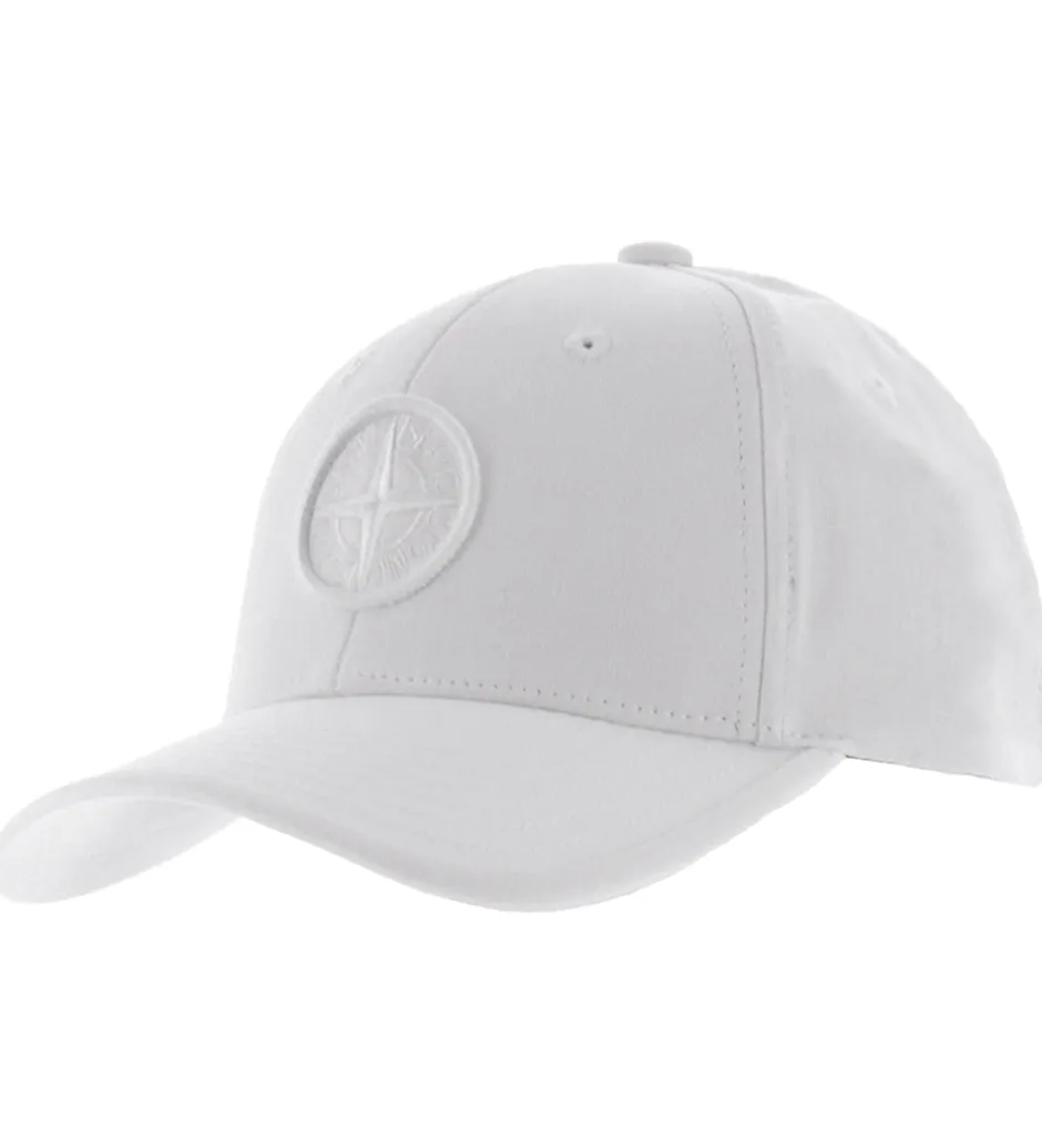Fin Stone Island kasket i ensfarvet hvid, og fortil er der broderet et stort logo.