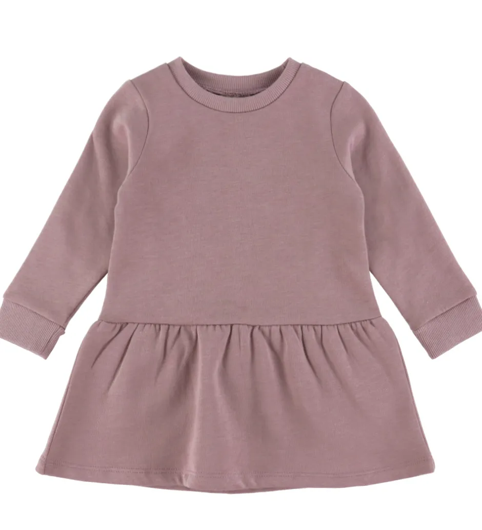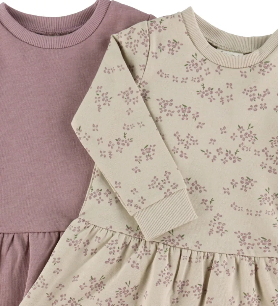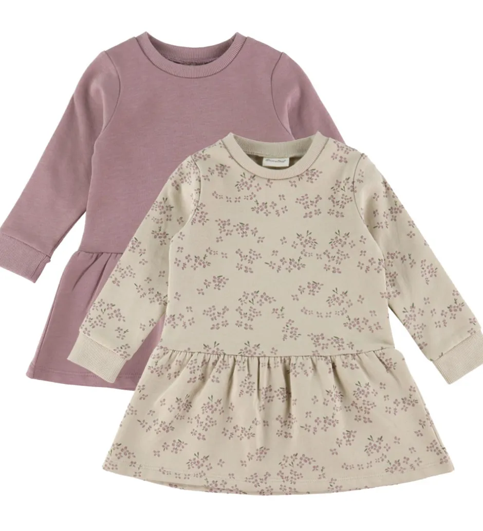 Flotte Minymo kjoler solgt i en 2-pak i en blød lilla nuance samt en beige variant med fint blomstertryk i lyslilla nuancer. Minymo kjolerne har lange ærmer og rund halsudskæring.