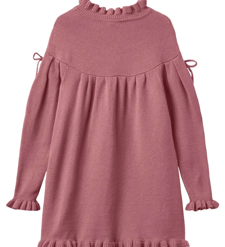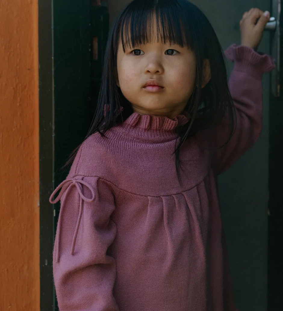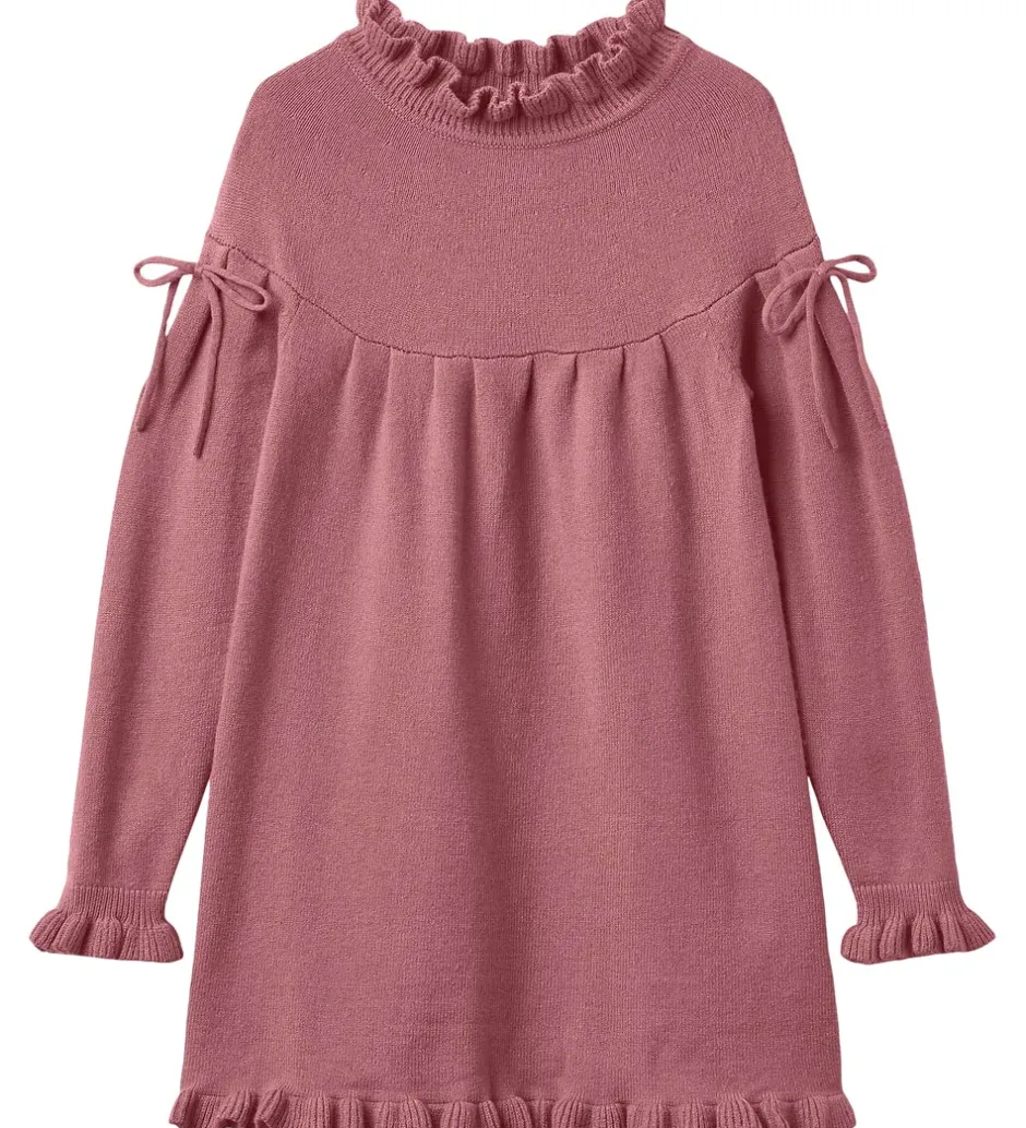 Elegant Fliink kjole i en varm rosa farve. Fliink kjolen har en strikket struktur med fine flæsekanter ved alle åbninger. Den har en mellemhøj, rund halsudskæring og lange ærmer med sløjfer ved skuldrene. Kjolen er fremstillet i en meget blød kvalitet.