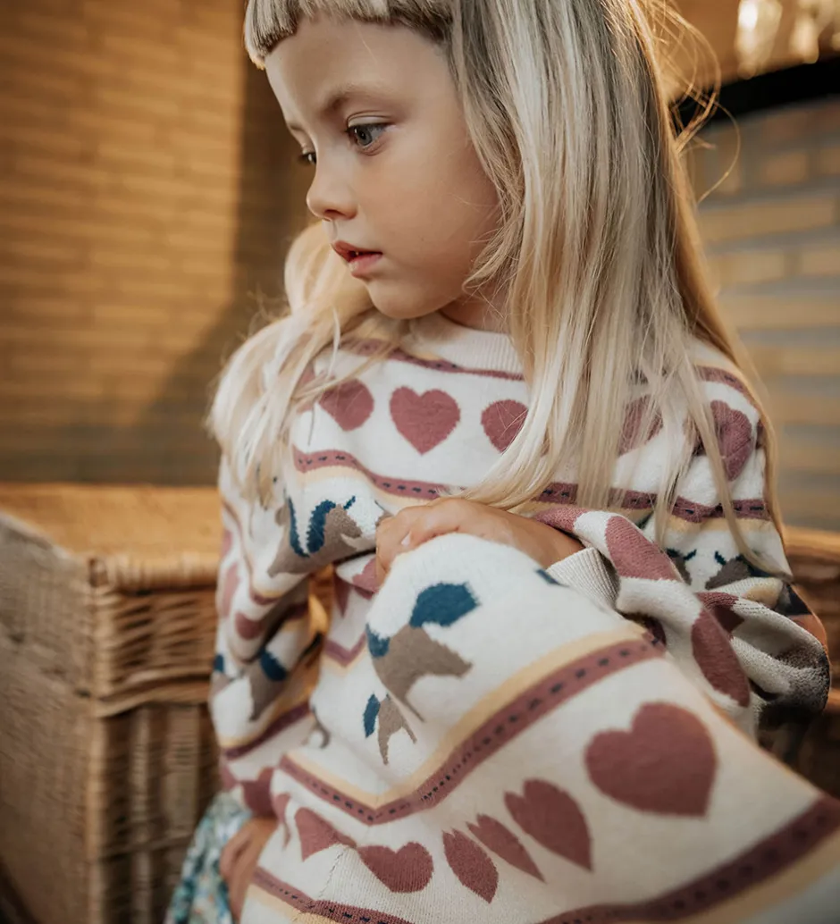 Fin Fliink kjole i beige med et mønster af hjerter og heste i rosa, brune og blå nuancer. Fliink kjolen har en rund halsudskæring og lange ærmer med rynker ved skuldrene. Den er fremstillet i en meget blød kvalitet.