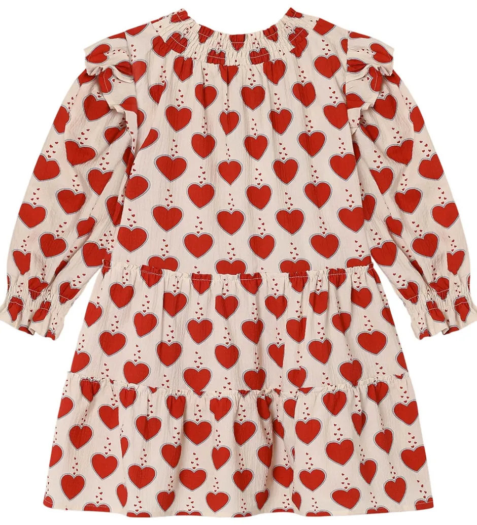 Elegant Fliink kjole i råhvid bæk og bølge med hjerteprint i rød. Kjolen har en rund, elastisk halsudskæring og lange ærmer med flæseafslutning. Ved skuldrene er der flæsedetaljer, og kjolen har god vidde i skørtet.