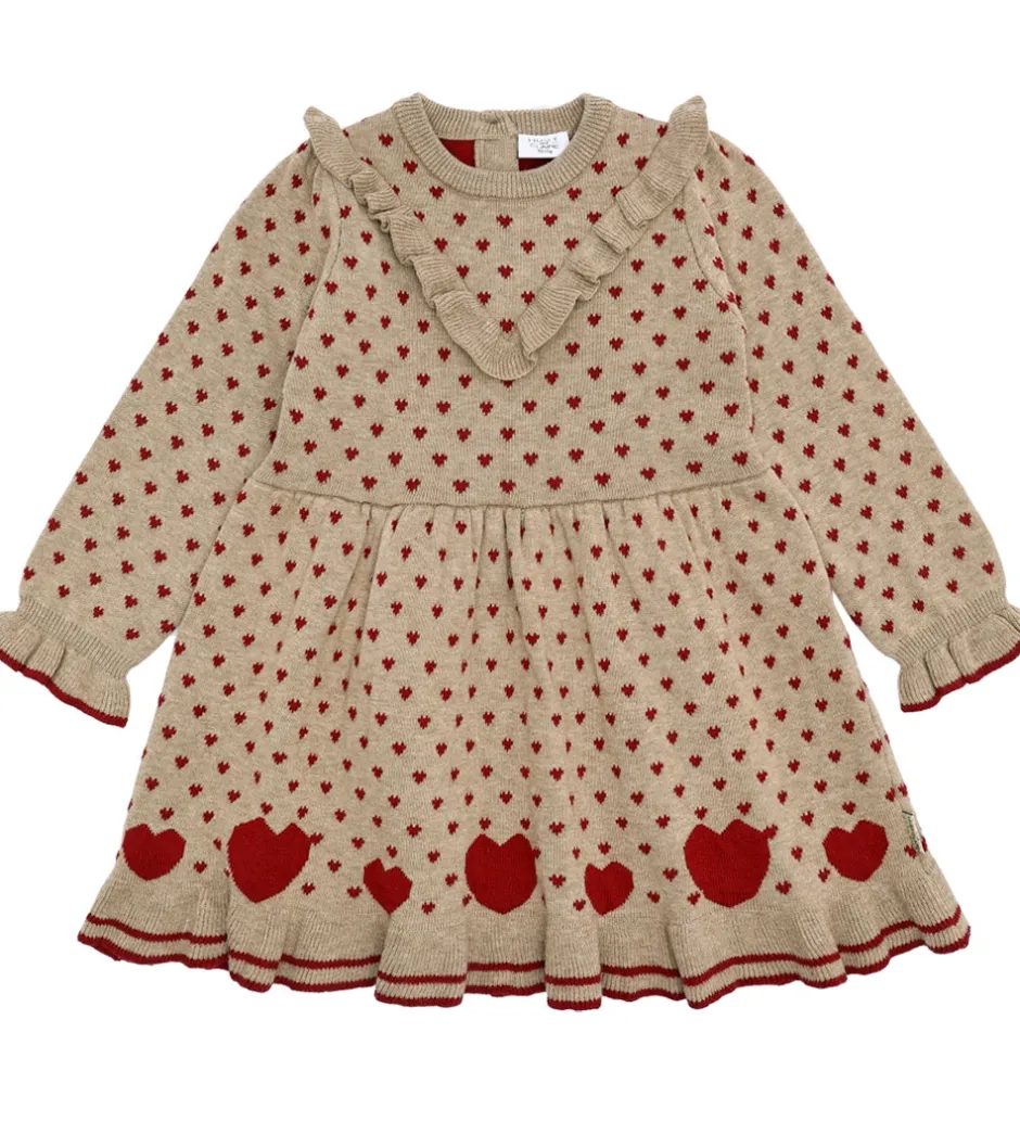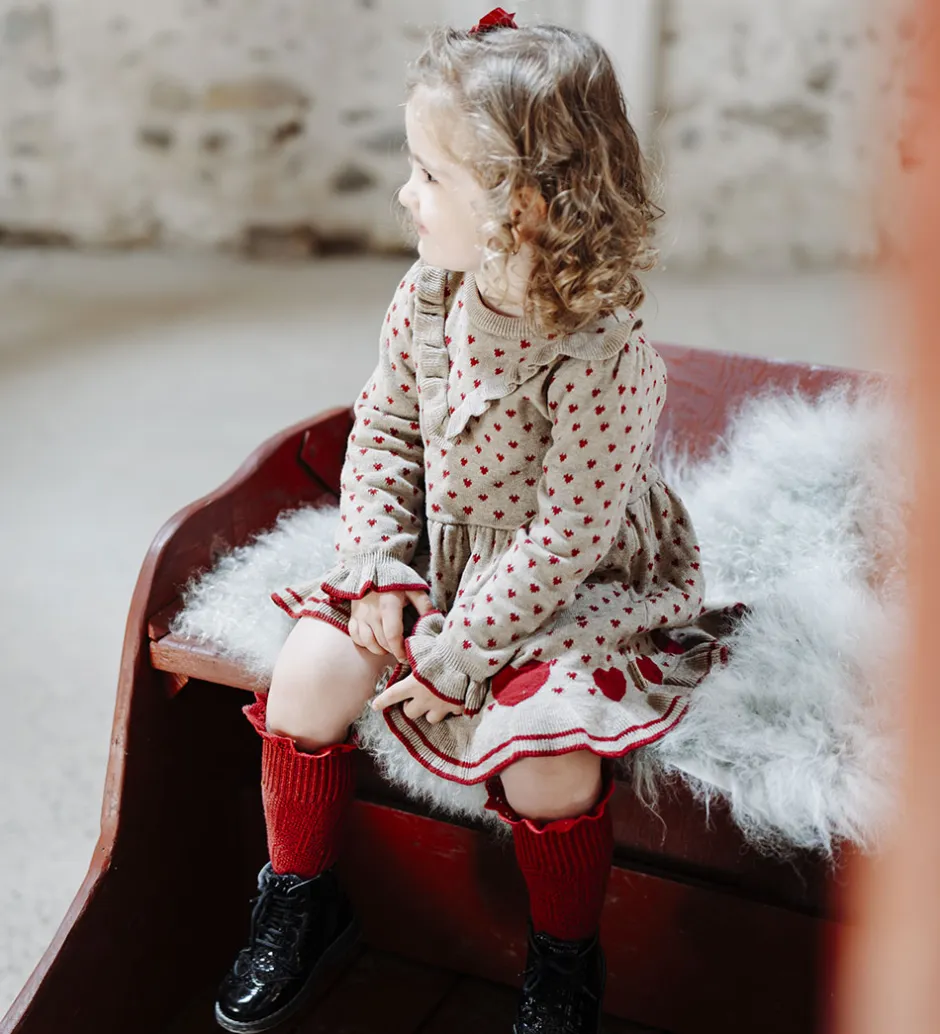 Smuk kjole fra Hust and Claire i en lys beige farve med røde hjerter. Kjolen har lange ærmer og en elegant flæsedetalje ved halsudskæringen. Kjolen er lavet i en strikket kvalitet, og den lukkes i nakken med knapper.