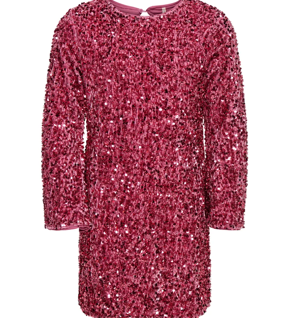 Glitrende Kids Only kjole i rosa velour med skinnende palietter i rosa. Kids Only kjolen har en rund halsudskæring med en knap i nakken og lange ærmer med god vidde ved håndleddene. Indvendigt er der et lag polyester, så kjolen er behagelig at have på.