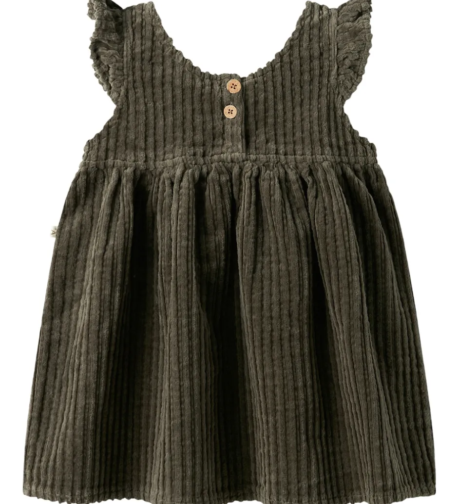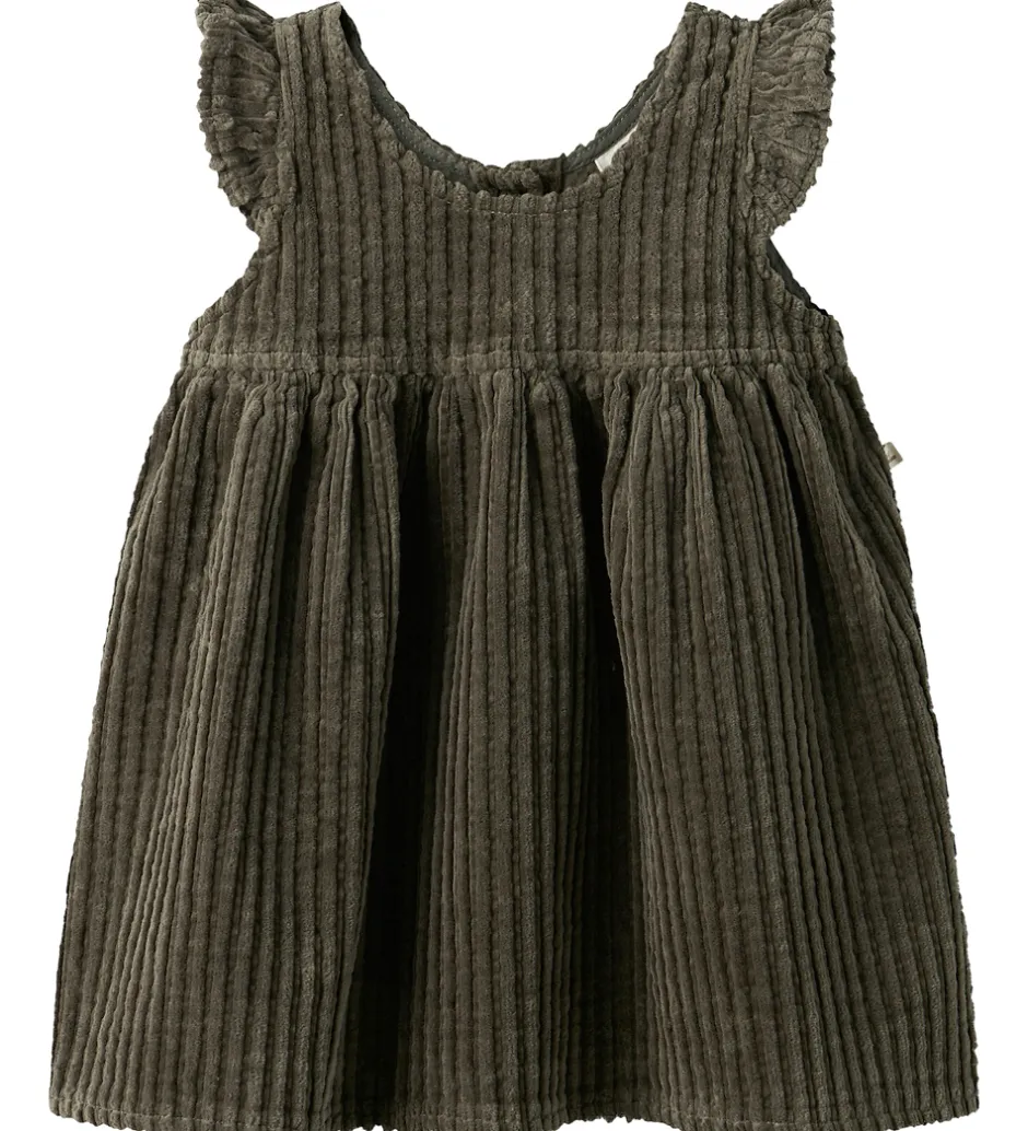 Elegant Lil Atelier kjole i mørkegrønt fløjl. Lil Atelier kjolen har korte ærmer med flæsedetaljer og en skøn, kraftig struktur. Den har et klassisk look med fine lodrette linjer.