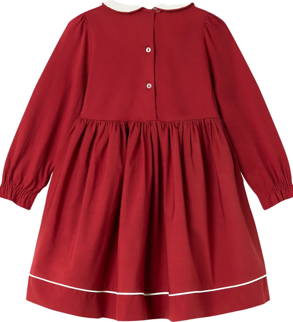 Elegant MarMar kjole i en dyb rød farve. MarMar kjolen har lange ærmer og en flot, hvid krave med små blomsterbroderier. Skørtet er plisseret, hvilket giver et klassisk udtryk, og kjolens kant er detaljeret med en tynd, hvid linje.
