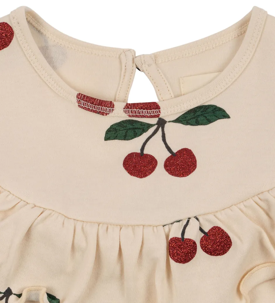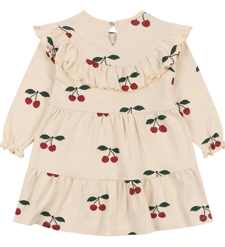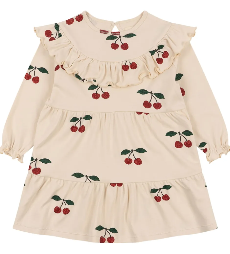 Kjolen er dekoreret med et charmerende kirsebærprint og har lange ærmer med elastiske kanter. Kjolen har flæsedetaljer på skuldrene og ned langs brystet, hvilket giver et feminint udtryk. Konges Sløjd kjolen er designet med en rund halsudskæring og en let a-formet facon.