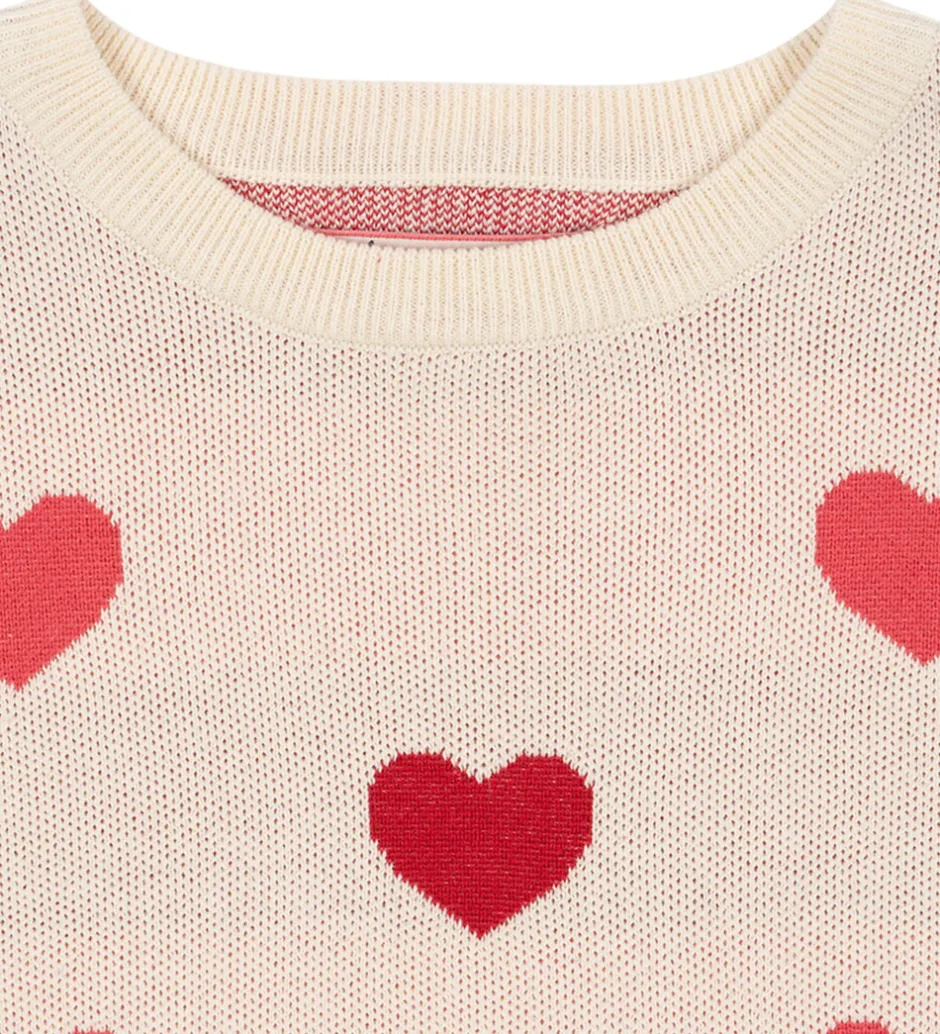 Skøn kjole fra Konges Sløjd strikket i lysebeige med et charmerende hjerteprint i rosa og røde nuancer. Den afslappede pasform gør den behagelig at bære, mens de lange ærmer tilføjer et ekstra lag af varme. Ribkanter ved hals, ærmer og bund fuldender det stilrene design fra Konges Sløjd.