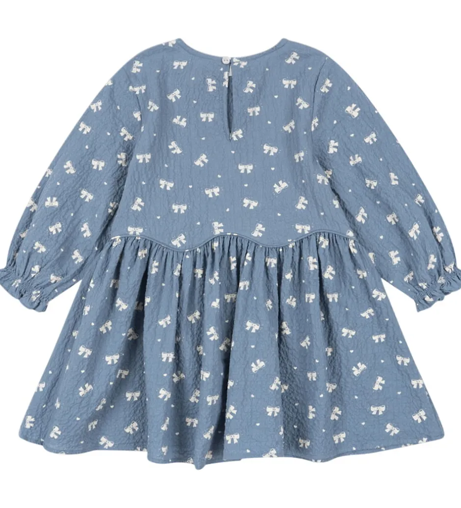 Smuk Konges Sløjd kjole i en støvet, blå nuance med et print af små, hvide sløjfer. Kjolen har lange ærmer med elastik ved håndleddene. Konges Sløjd kjolens nederdel har en flot struktur og en let rynket effekt i taljen.