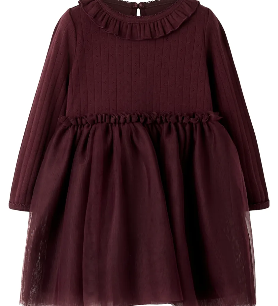 Elegant Lil Atelier kjole i bordeauxrød. Lil Atelier kjolen har fint hulmønster på den øverste del, mens den nerste del består af en lag økologisk bomuld inderst og flere lag mesh yderst. Kjolen har lange ærmer og en rund hals med flæsedetaljer og en knap i nakken.