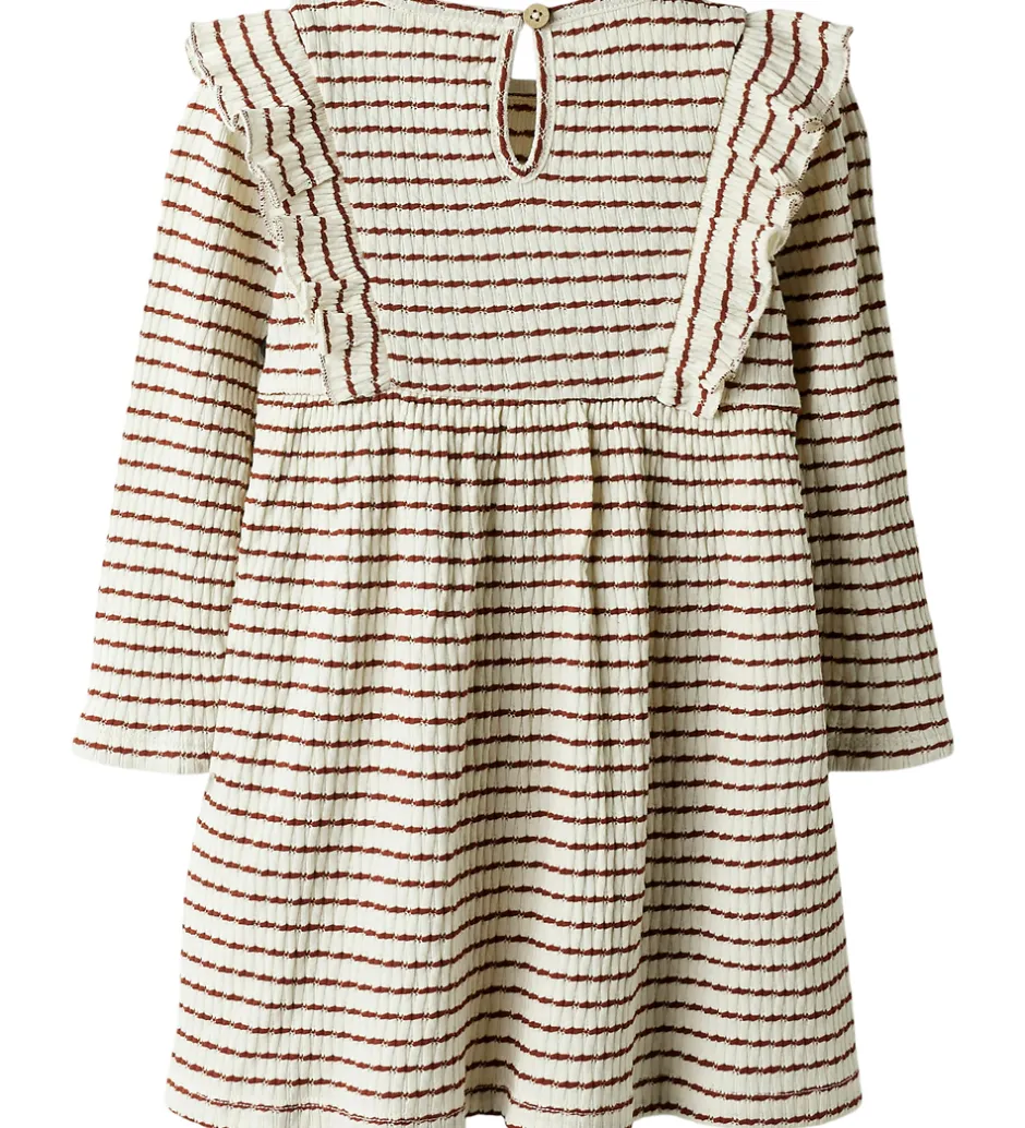 Smagfuld Lil’ Atelier kjole i cremehvid med horisontale, rødbrune striber. Lil’ Atelier kjolen har lange ærmer og charmerende flæsedetaljer ved skuldrene. Strukturen er let ribbet, hvilket giver en fin tekstur.