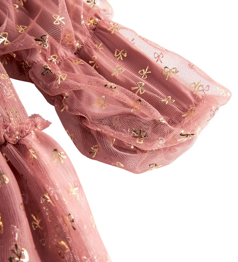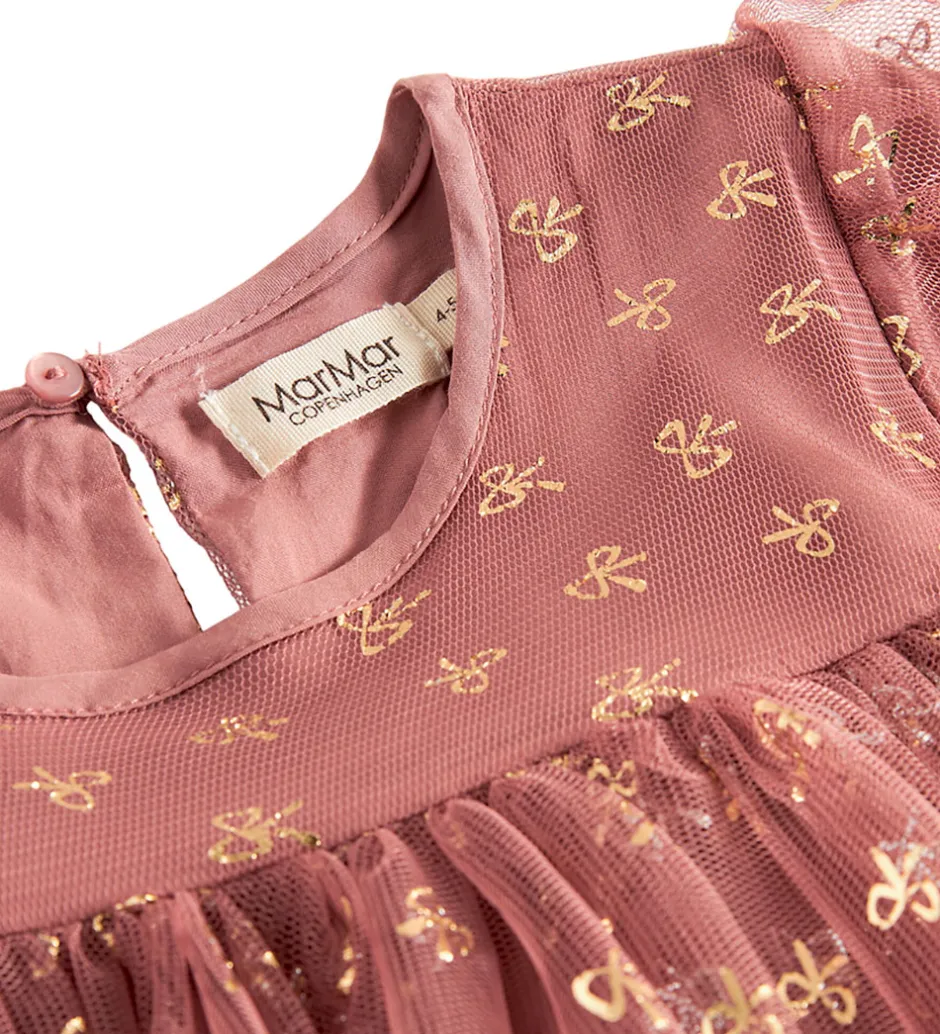 Elegant MarMar kjole i støvet rosa. MarMar kjolen har lange ærmer og et flot mønster med gyldne detaljer. Kjolens stof har en let gennemsigtig overflade med flere lag, der giver dybde. En stilfuld ryg med knaplukning fuldender designet.