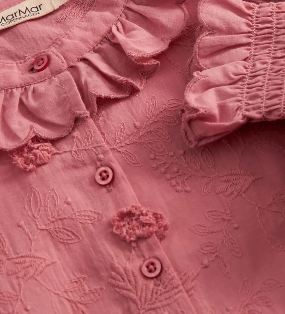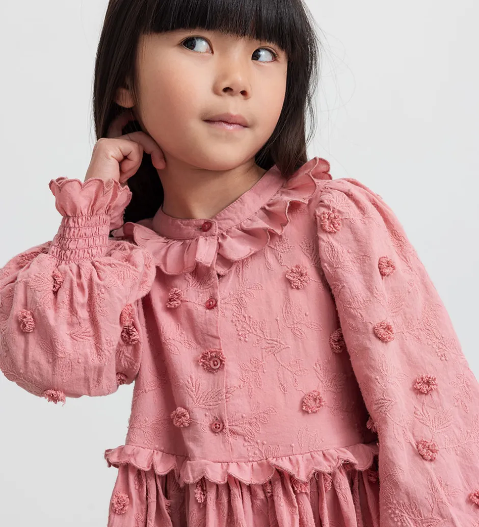 Elegant MarMar kjole i en støvet, rosa nuance. MarMar kjolen har lange ærmer med elastik og flæser ved håndleddene.