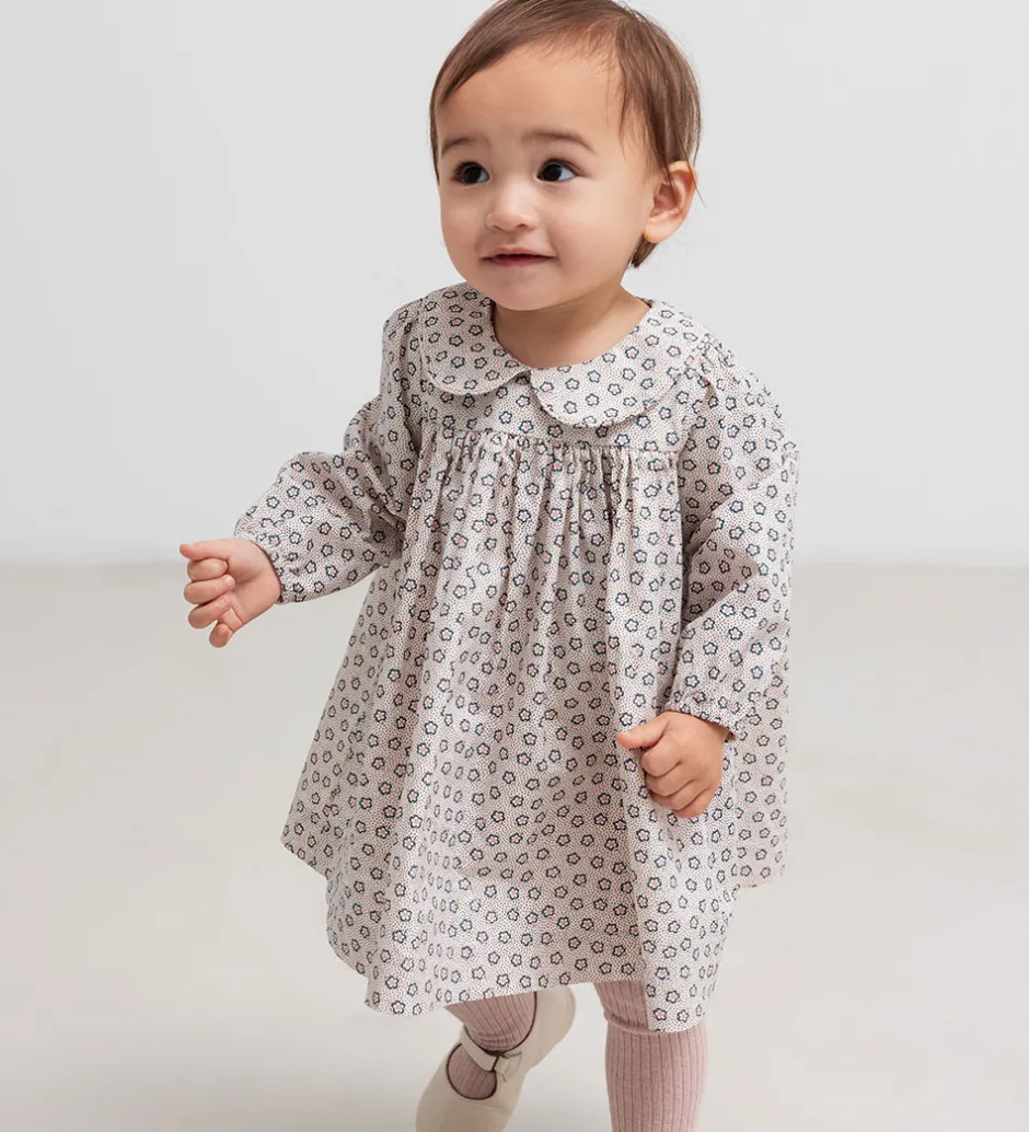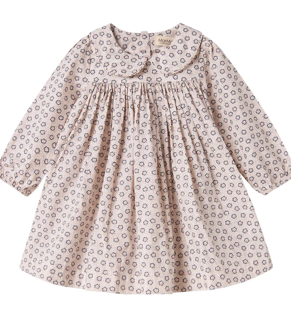 Elegant MarMar kjole i cremehvid med lange ærmer. MarMar kjolen har en fin krave og et diskret mønster med blomster og prikker i mørkeblå, brun og rosa. Skørtet folder sig let og giver kjolen et klassisk udseende.