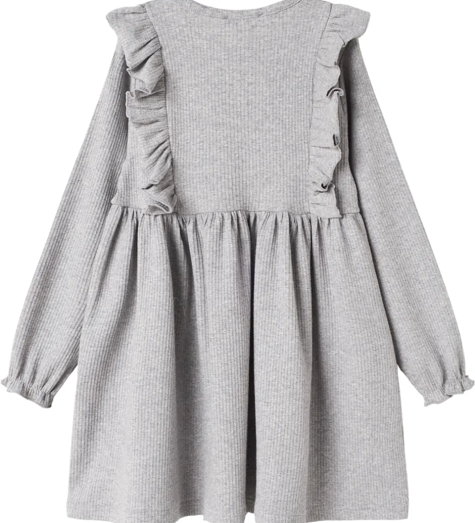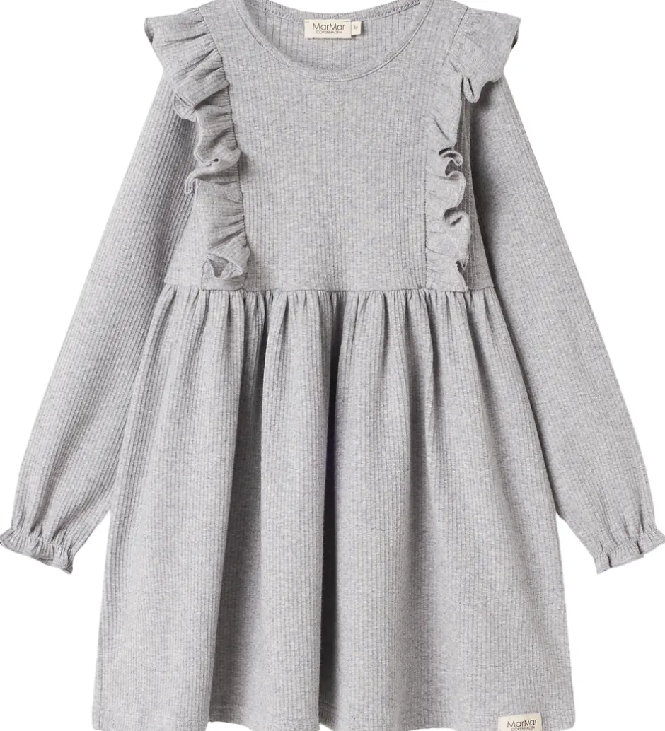 Elegant MarMar kjole i en lys grå nuance. Kjolen fra MarMar har lange ærmer og flotte flæsedetaljer langs skuldrene. Den er designet med en let ribbet tekstur og en rund halsudskæring.