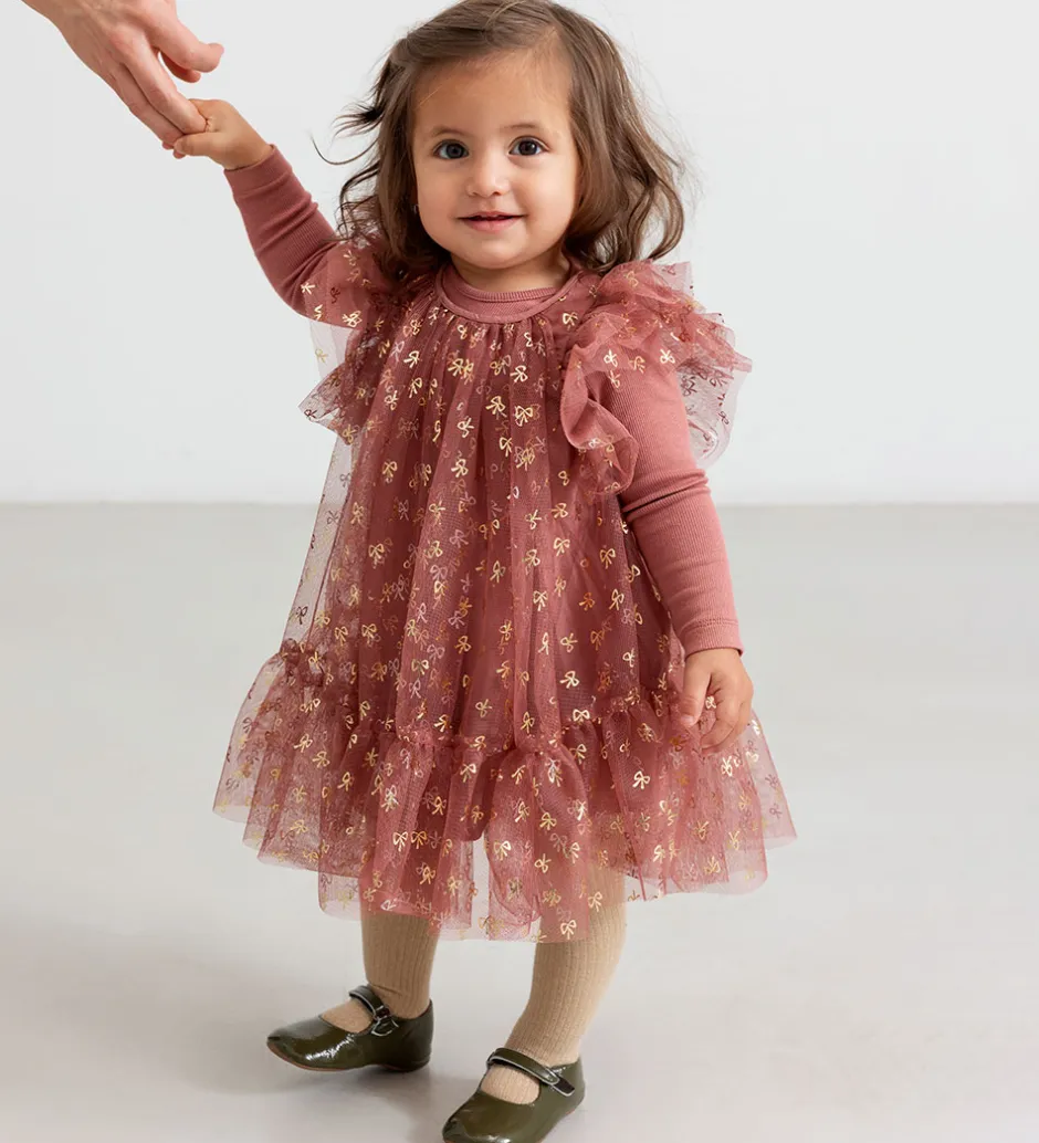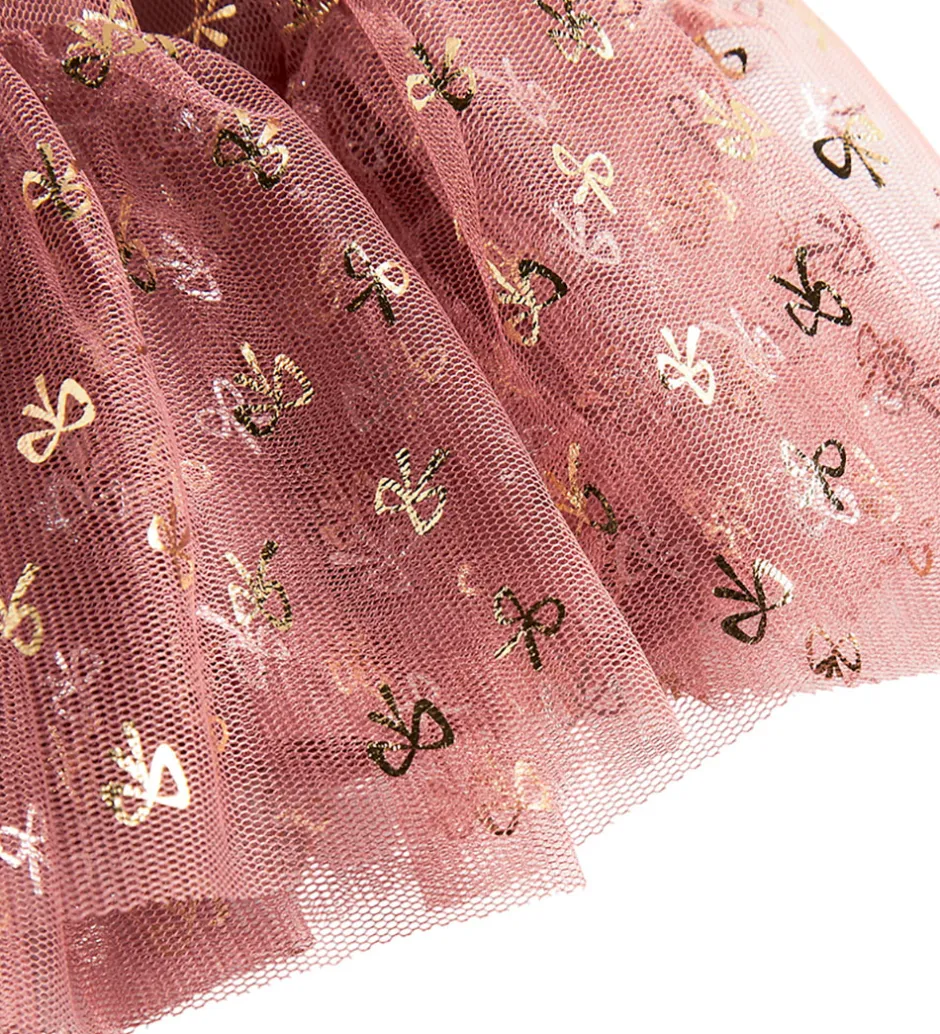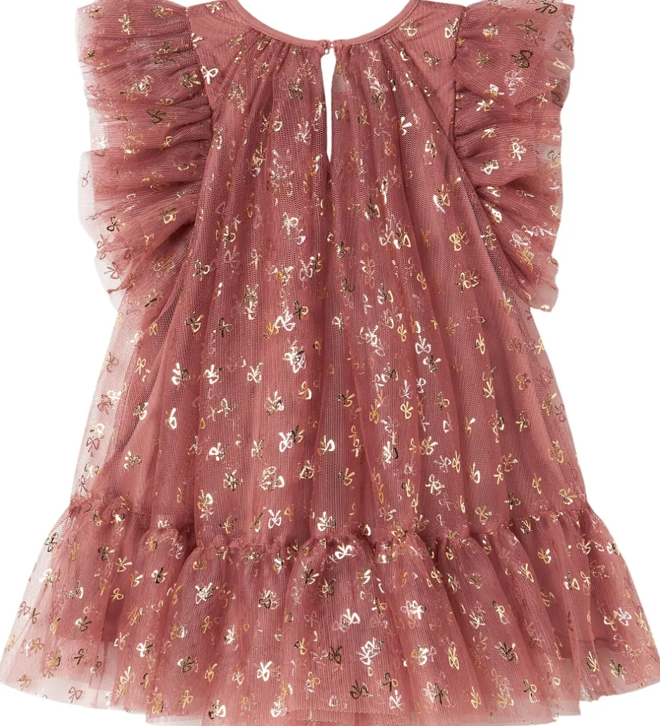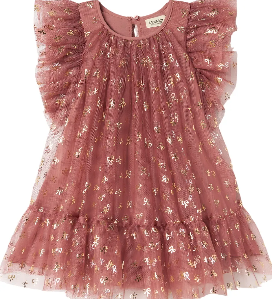 Elegant MarMar kjole i en smuk støvet rosa nuance, dekoreret med fine guldfarvede sløjfer. Kjolen har korte ærmer med voluminøse flæser, der giver et stilfuldt udtryk. MarMar kjolen er fremstillet i et let og luftigt materiale med lag, der skaber en flot silhuet.