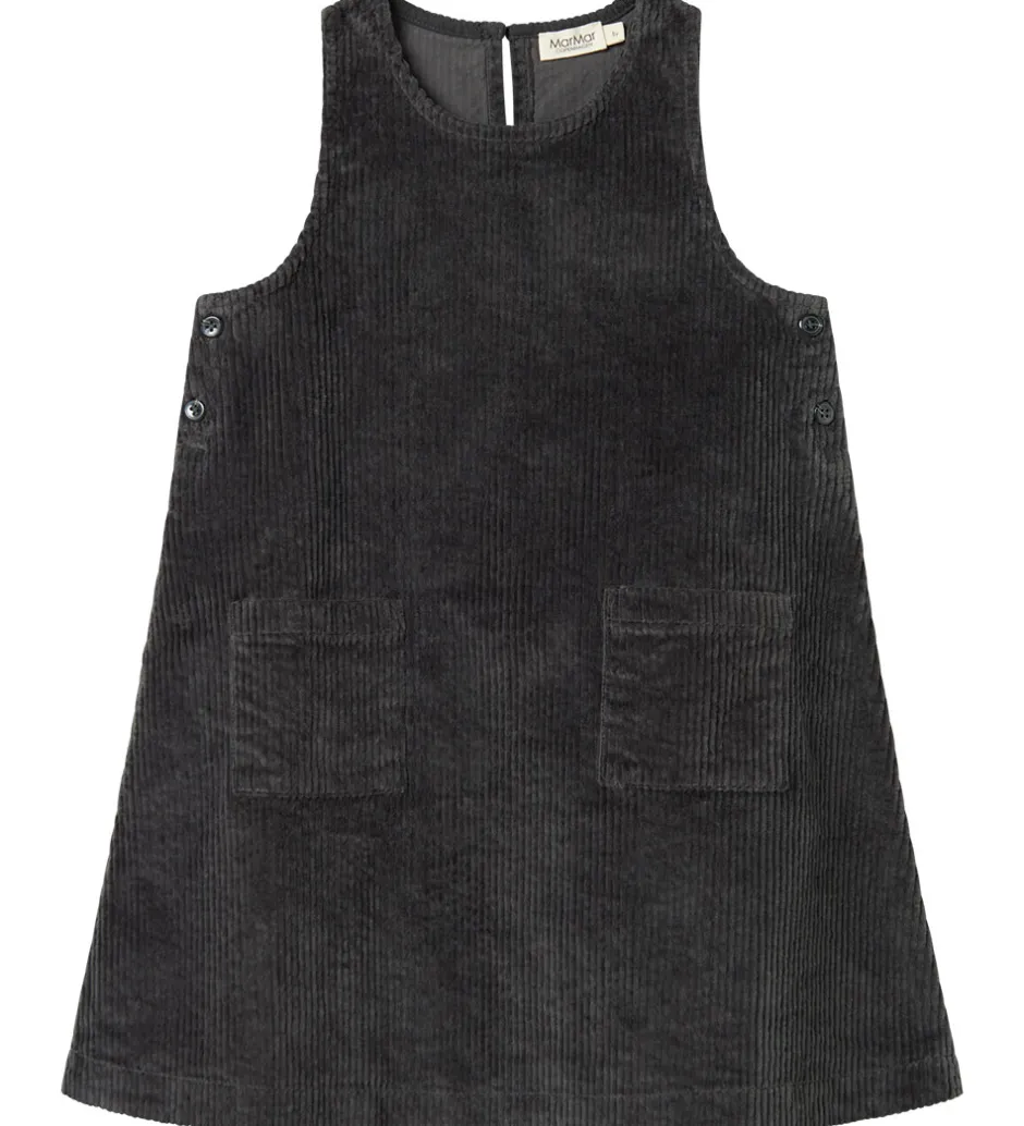 Stilren MarMar spencer i en dyb, mørkegrå farve. MarMar spenceren er lavet i blødt fløjl med en ærmeløs A-form og små knapper på siden. Foran har spenceren to praktiske lommer, der tilføjer et funktionelt element til designet.