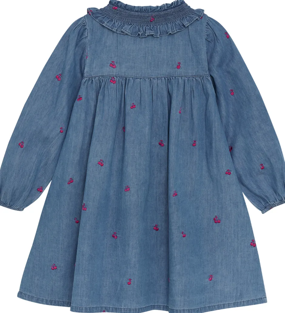 Elegant Minymo kjole i blåt denim med broderede, røde kirsebær. Kjolen er lavet i en let, fastvævet kvalitet.
