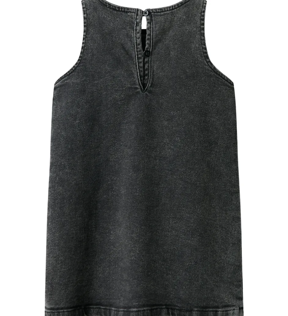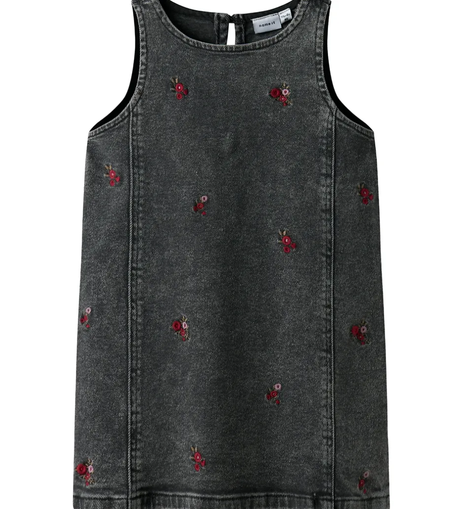 Elegant Name It denimkjole i mørkegrå med vasket look og små, broderede blomster i mørkerød og lilla. Denimkjolen har brede skulderstropper, og en rund halsudskæring. Kjolen lukkes med knapper i nakken. Den har et lige snit, og egner sig til både hverdag og festlige lejligheder.