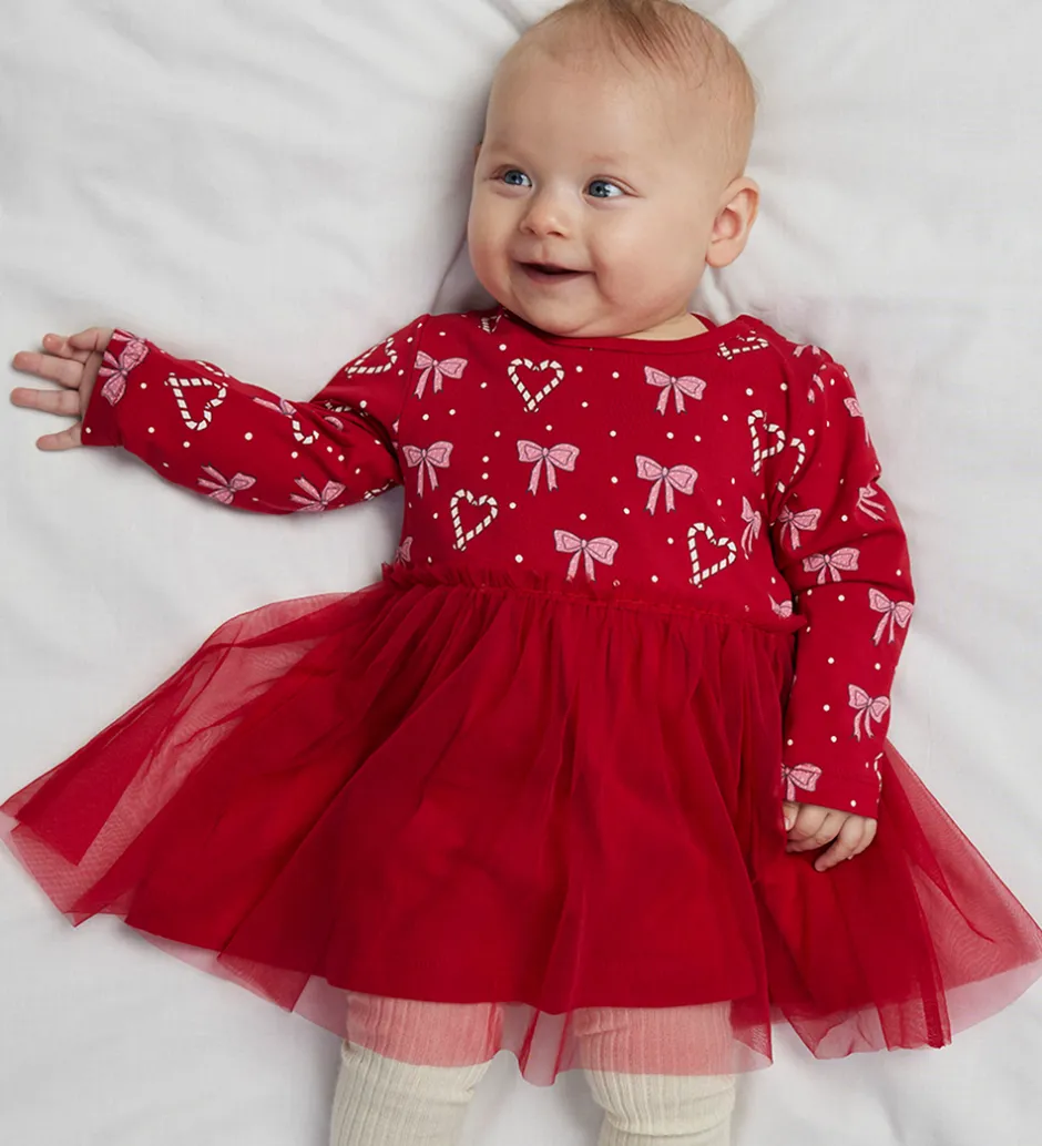 Fin Name It kjole i rød med print øverst af sløjfer, slikstokke formet som hjerter og små, hvide prikker. Kjolen har en rund halsudskæring og lange ærmer. Den er skåret under brystet, hvor den nederste del består af et lag økologisk bomuld inderst og et lag tyl yderst.