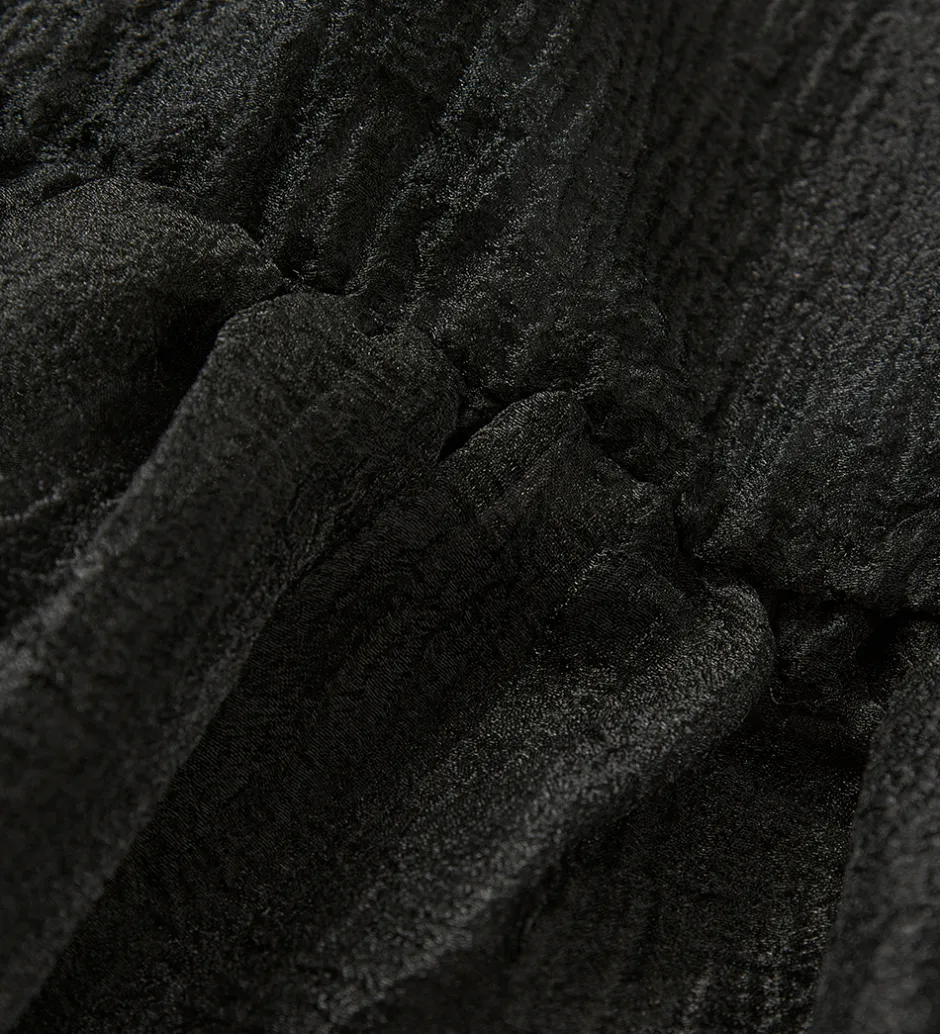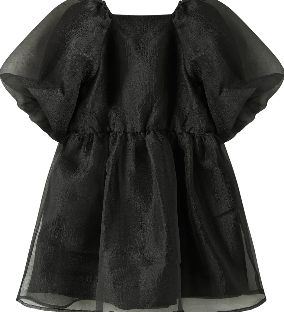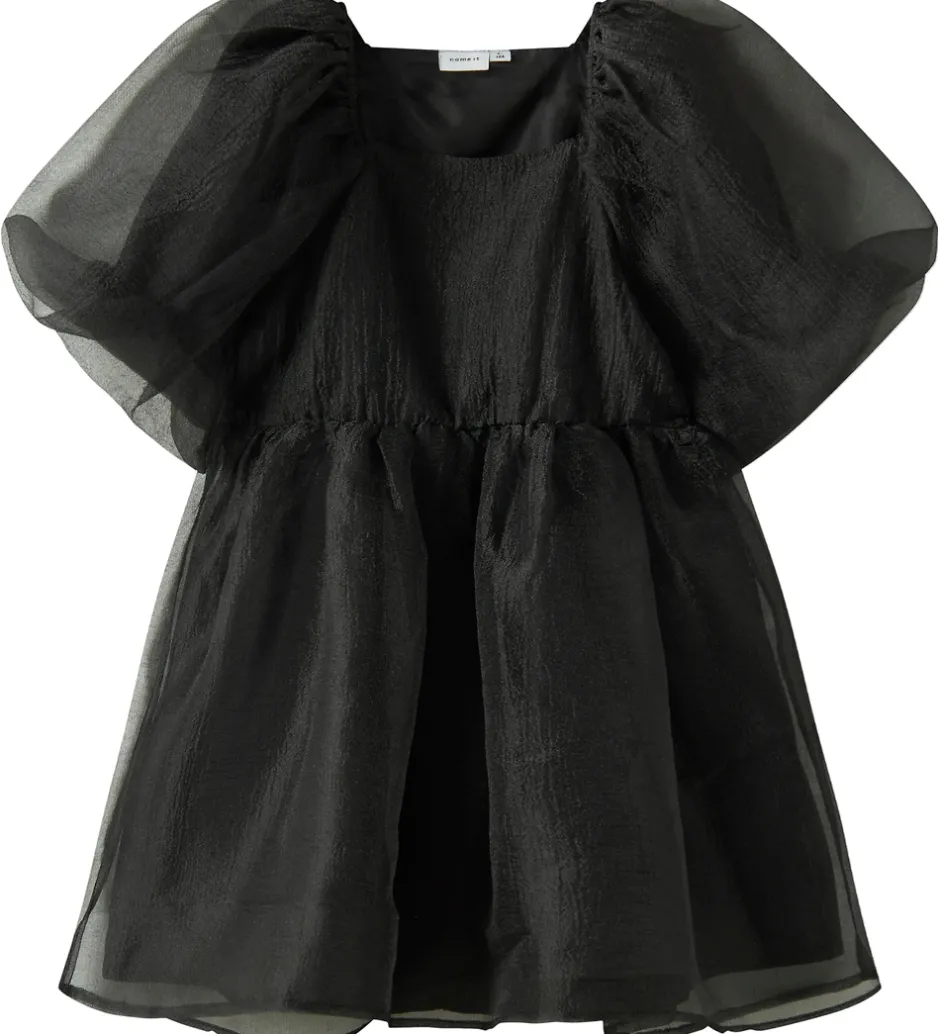 Elegant Name It kjole i sort med flot struktur, som giver en let glitrende effekt. Kjolen har volumenøse pufærmer og en firkantet halsudskæring. Name It skjolen er skåret ved taljen med let rynkeeffekt, der skaber et flydende fald. Kjolen består af to lag genanvendt polyester, hvoraf det yderste lag har et semitranparent look.