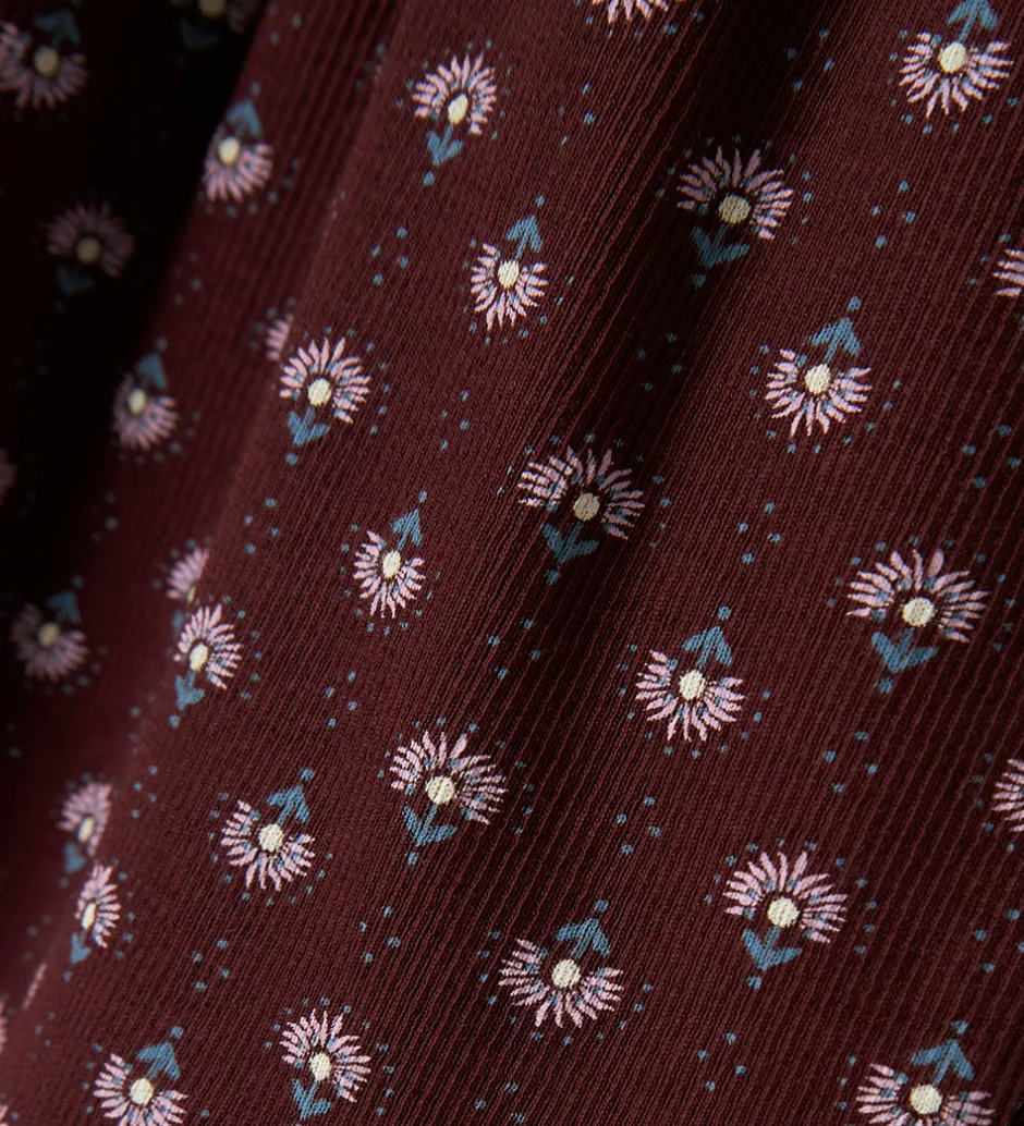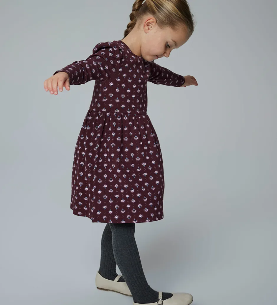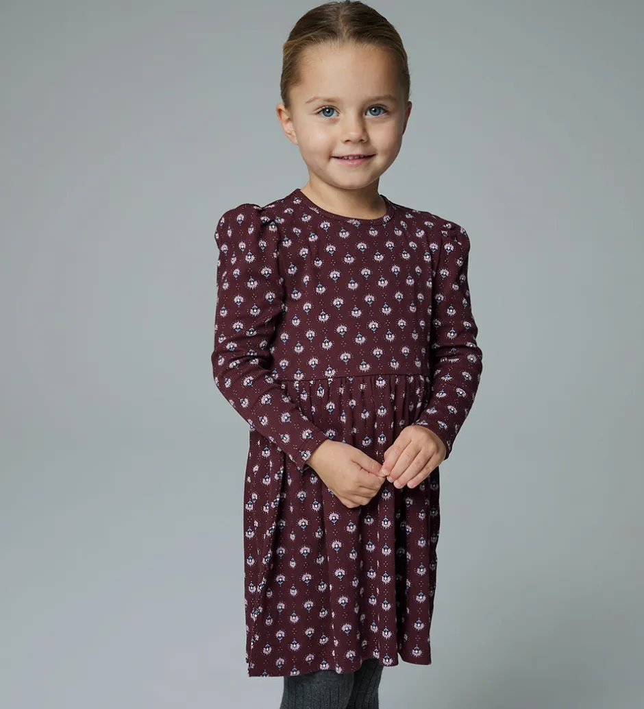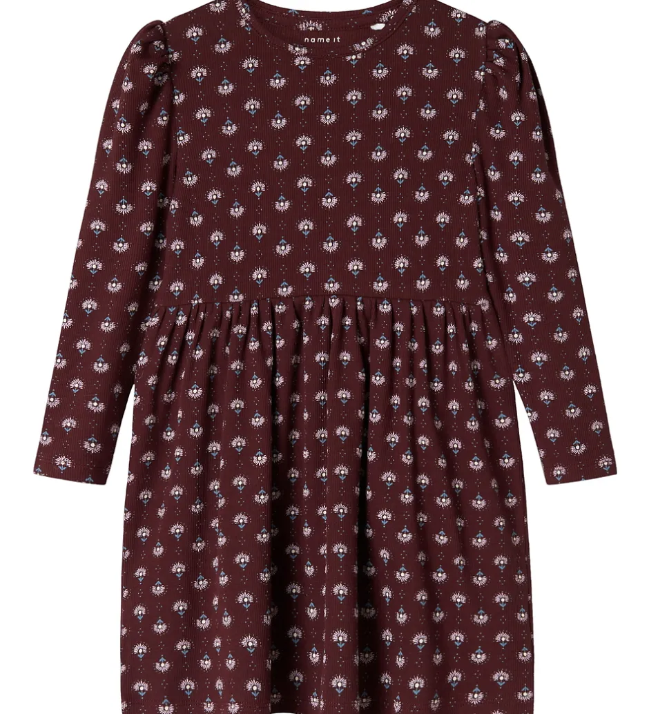 Flot Name It kjole i bordeauxrød med ribstruktur og blomsterlignende print i rosa, blå og hvid. Kjolen har en rund halsudskæring og lange ærmer med puf ved skuldrene. I taljen er der en elastisk syning, som giver en flot pasform.
