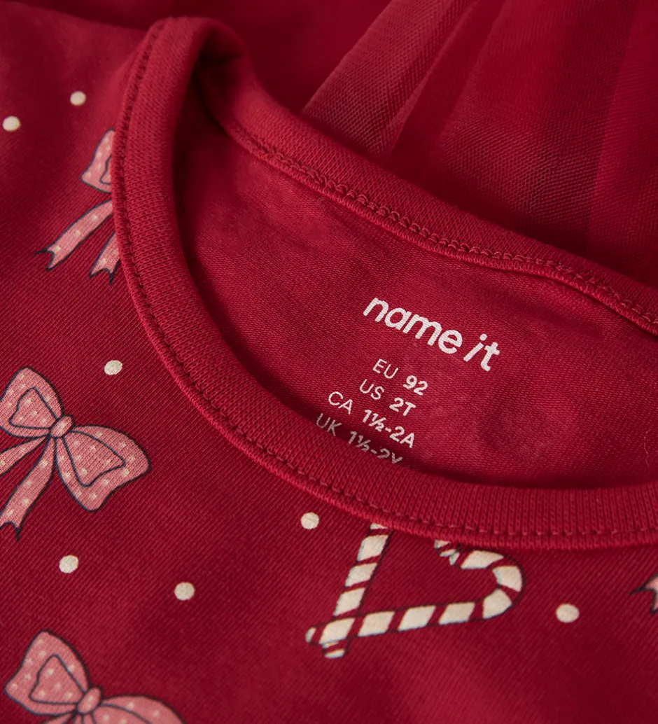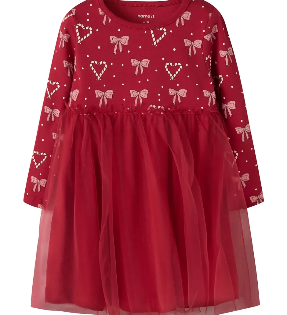 Fortryllende Name It kjole i rød med print på den øverste del af sløjfer, hjerter og hvide prikker. Name It kjolen har en rund halsudskæring og lange ærmer. Den er skåret ved taljen, hvor den nederste del af har et lag tyl yderst.