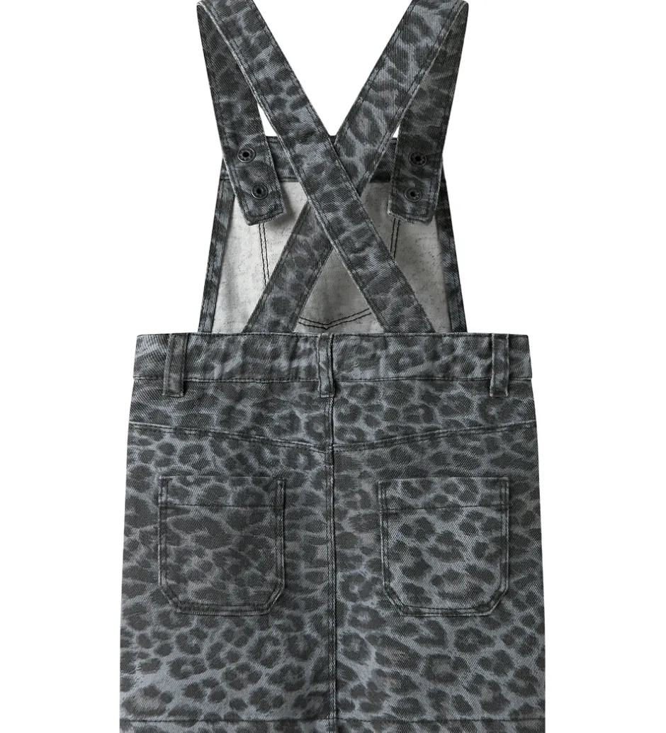 Stilfuld Name It spencer i denim med leopardprint i grå nuancer. Name It spenceren har en klassisk overalls-stil med seler, som knappes på foran. Selernes kan knappes i to længder. Derudover er der en knap i venstre side af taljen, som gør det let at få spenceren af og på. Foran er der en brystlomme og to lommer i siderne. Bagpå er der to baglommer.