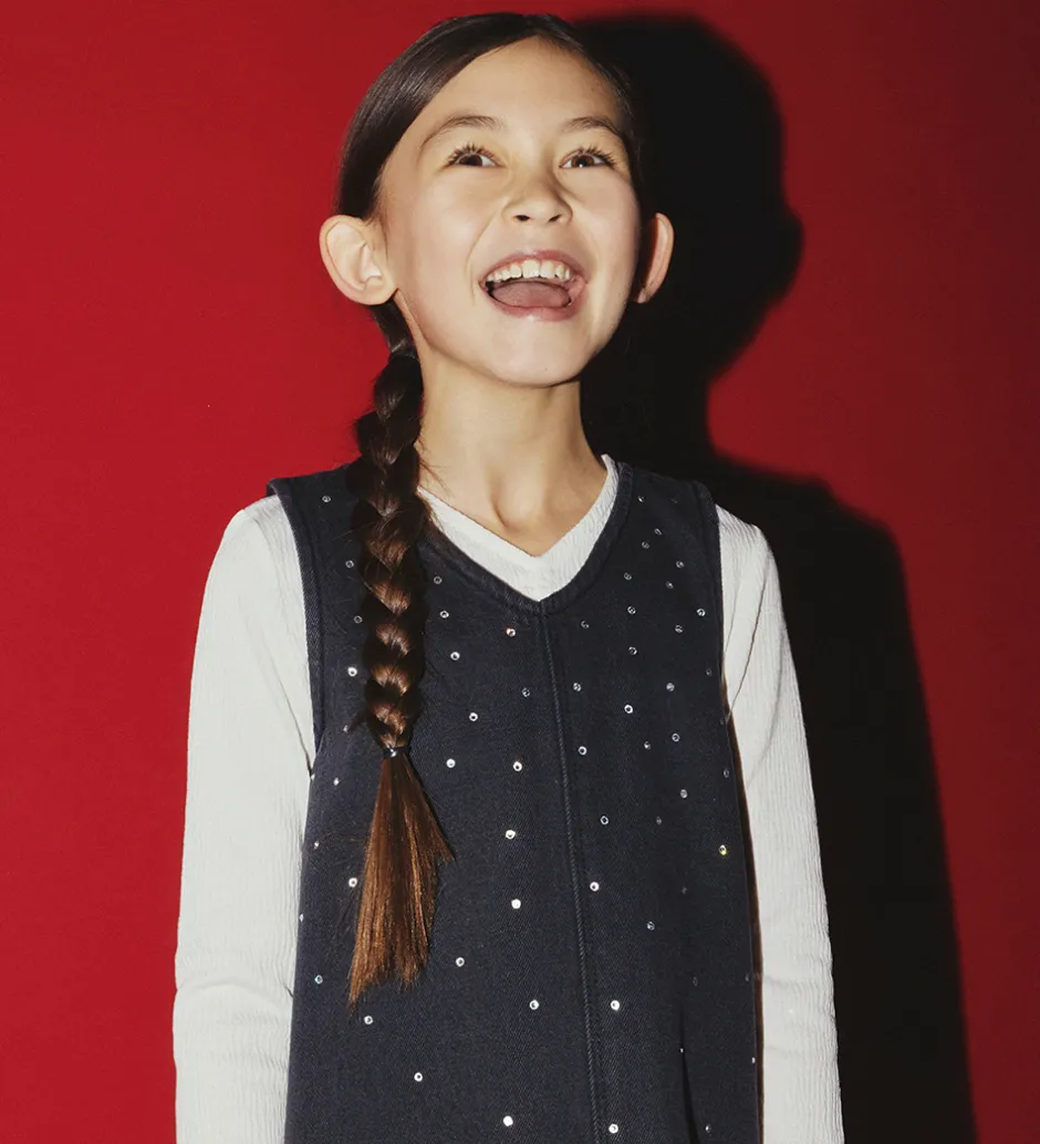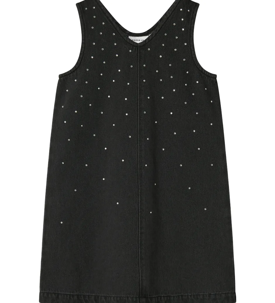 Elegant Name It spencer i vasket mørkegrå denim med små similisten i sølv på fronten. Spenceren er ærmeløs med brede skulderstropper og en blød v-udskæring. Spenceren har et enkelt deisgn med et lige snit.