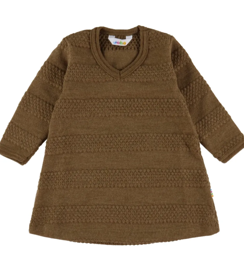 Flot Joha kjole i brun strik med stribet struktur. Kjolen har en enkel v-udskæring og lange ærmer. Den er lavet i blødt merinould.