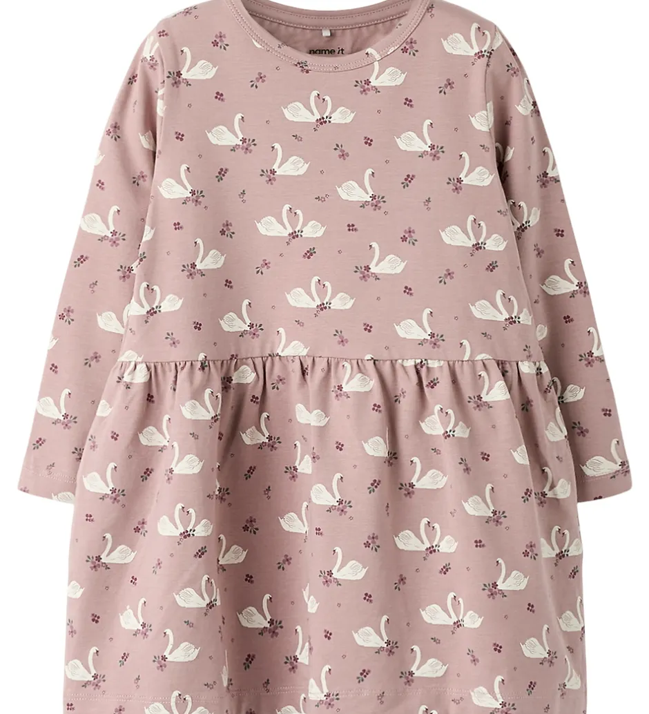 Fin Name It kjole i en støvet, rosa nuance, dekoreret med et mønster af hvide svaner samt små blomster, der tilføjer en elegant detalje.