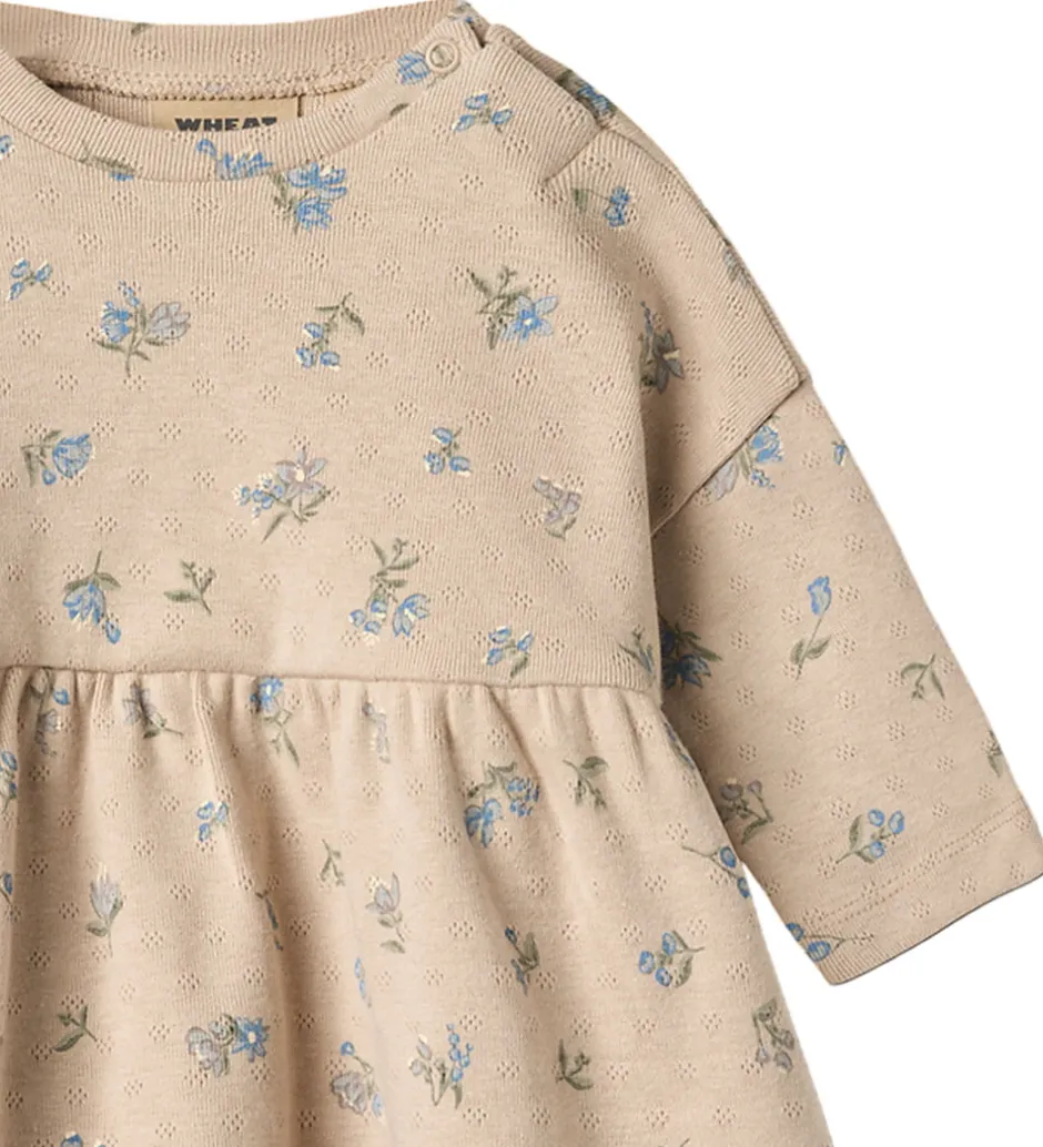 Yndig Wheat kjole i en lys beige nuance og med et delikat allover blomstermønster i blå og grønne toner. Wheat kjolen har en praktisk åbning med trykknapper over venstre skulder samt en elastisk syning i taljen, for en god og behagelig pasform.