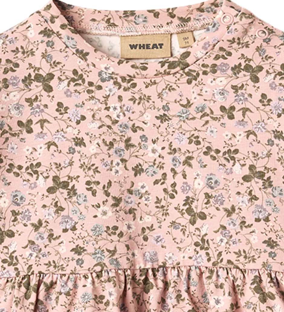 Smuk Wheat kjole i lys rosa med et allover småblomstret print i hvide, grønne og blå nuancer. Ved venstre skulder er der en åbning med trykknapper, så den er lettere at få af og på.